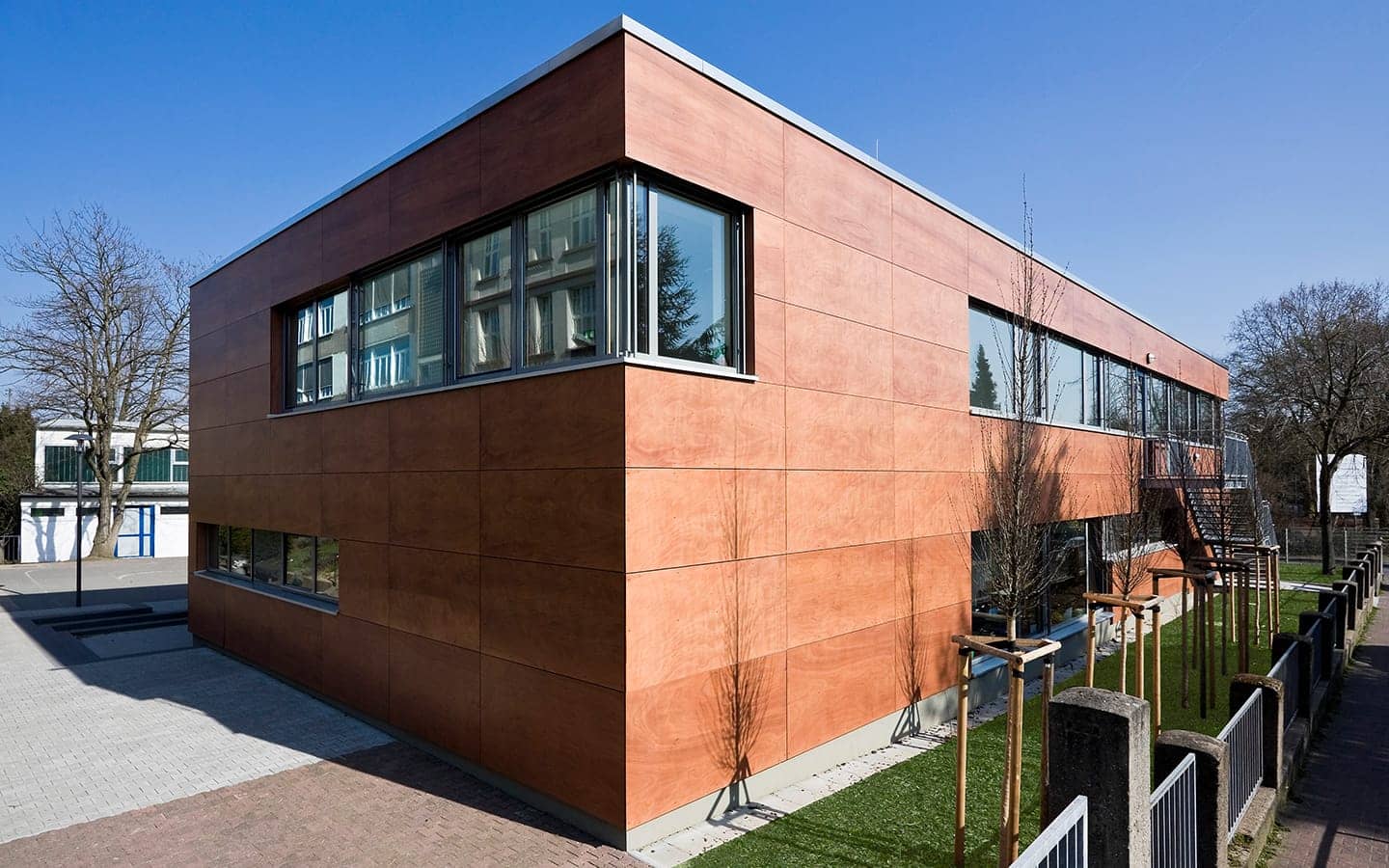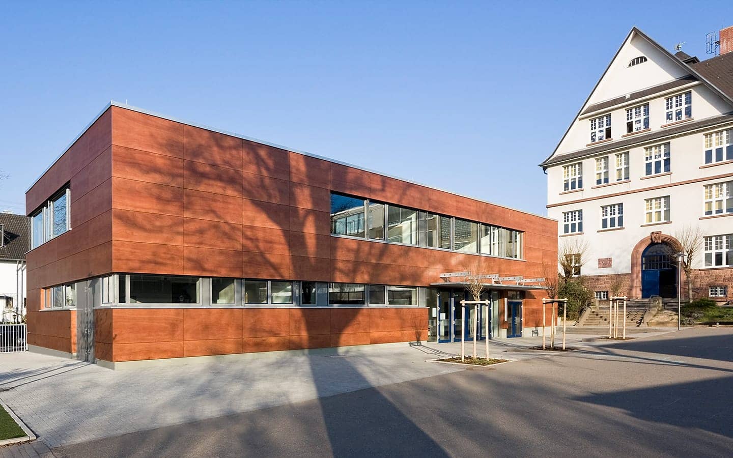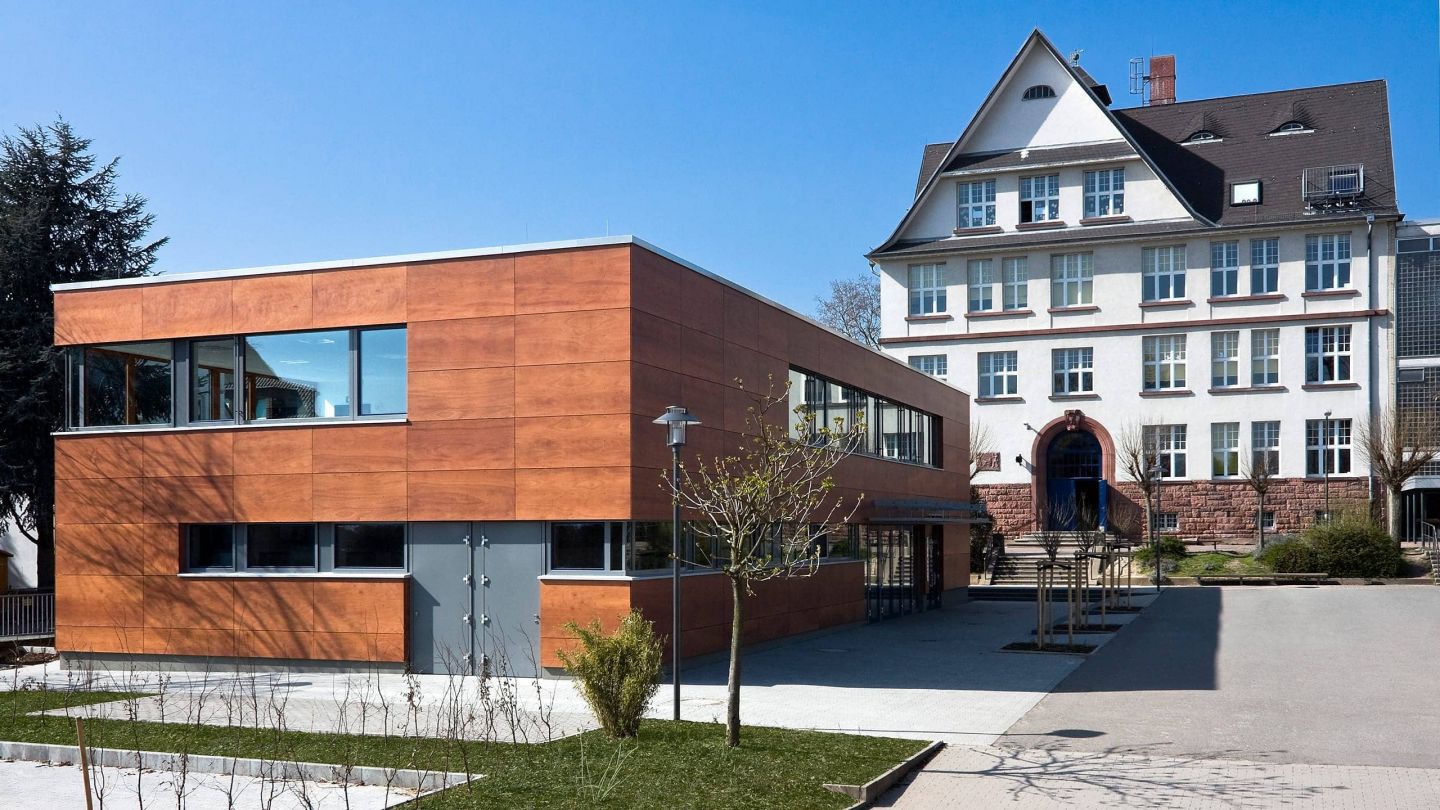 Das äußere Erscheinungsbild des Ergänzungsbaus vermittelt zwischen der Bebauung des Ortskernes und dem Übergang zur Landschaft des Sossenheimer Rieds. Der Baukörper fügt sich in das bestehende Ensemble ein. Der mit einer Holzfassade verkleidete Kubus mit seinen umlaufenden Fensterbändern wurde so positioniert, dass für den Schulhof noch eine größtmögliche Fläche entstanden ist und gleichzeitig die Nähe zum Hauptgebäude den Schulalltag erleichtert.