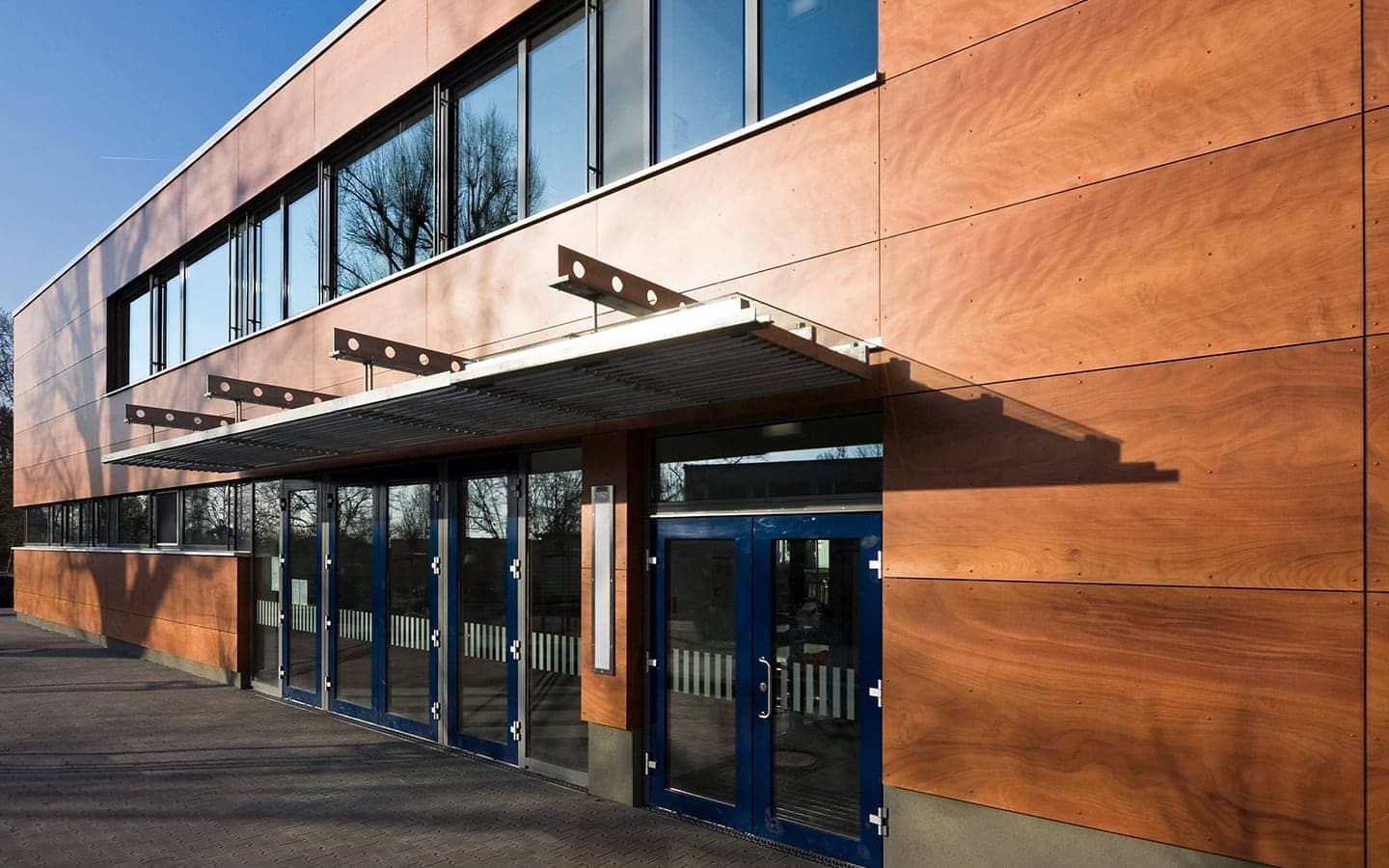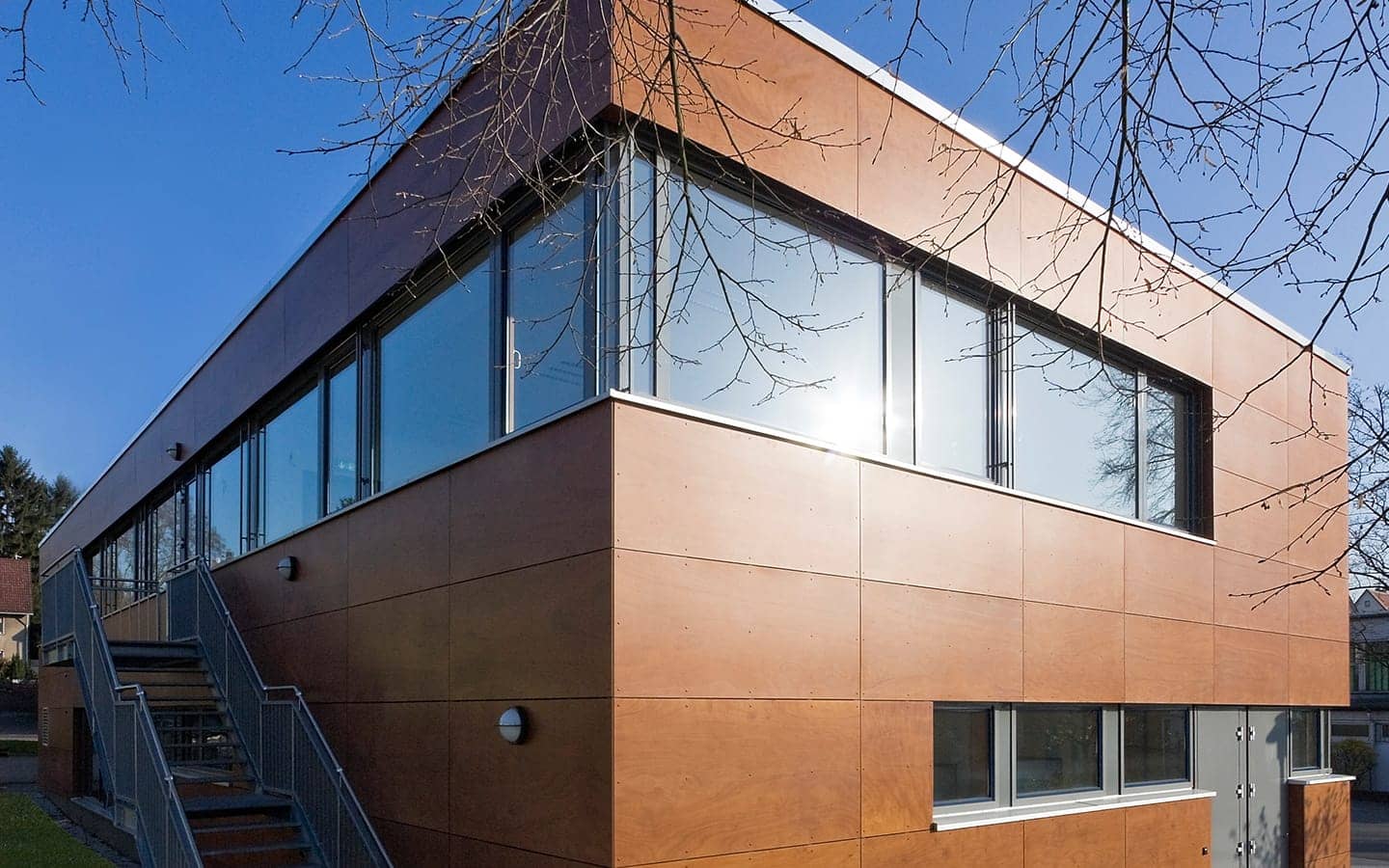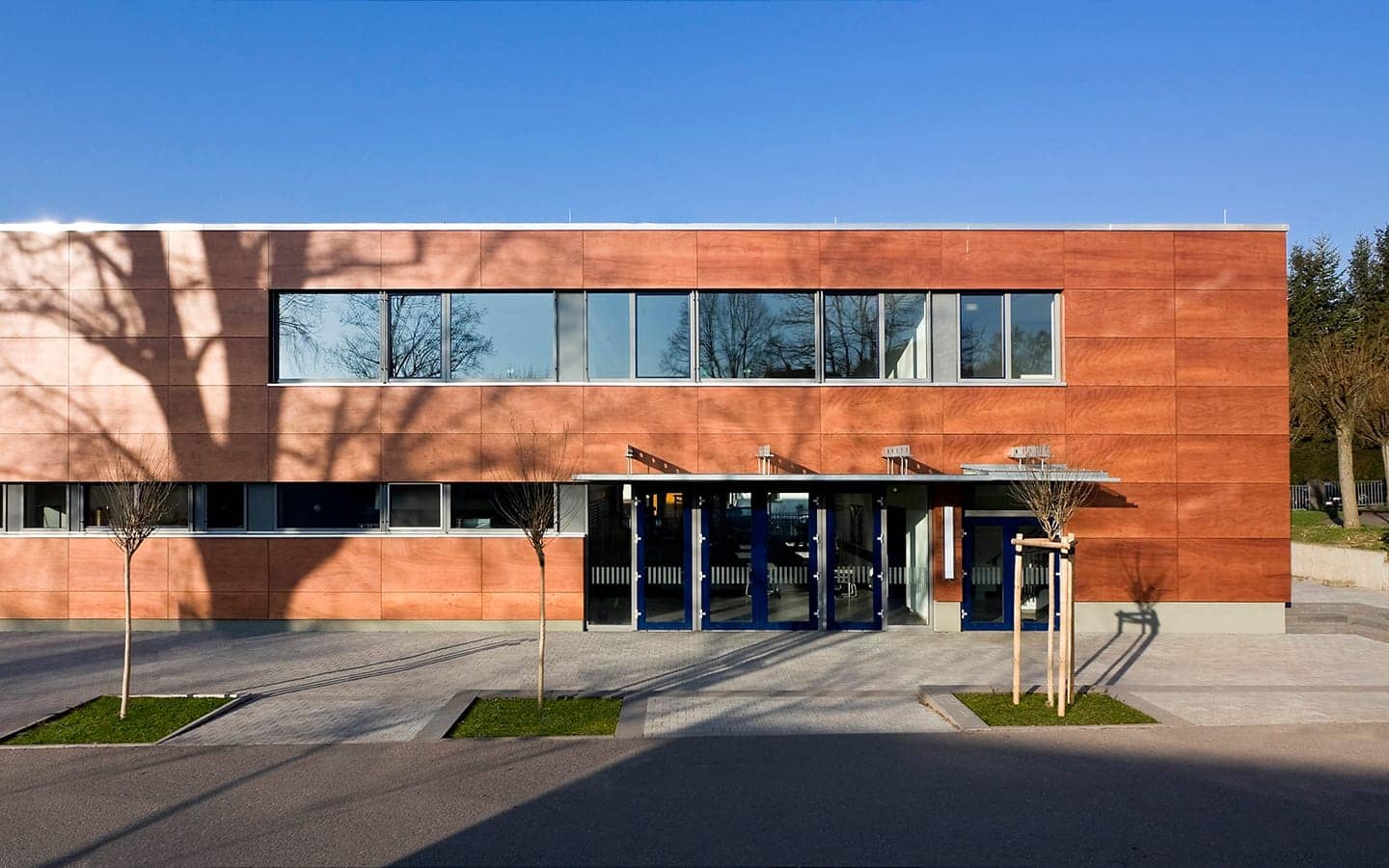 Das äußere Erscheinungsbild des Ergänzungsbaus vermittelt zwischen der Bebauung des Ortskernes und dem Übergang zur Landschaft des Sossenheimer Rieds. Der Baukörper fügt sich in das bestehende Ensemble ein. Der mit einer Holzfassade verkleidete Kubus mit seinen umlaufenden Fensterbändern wurde so positioniert, dass für den Schulhof noch eine größtmögliche Fläche entstanden ist und gleichzeitig die Nähe zum Hauptgebäude den Schulalltag erleichtert.