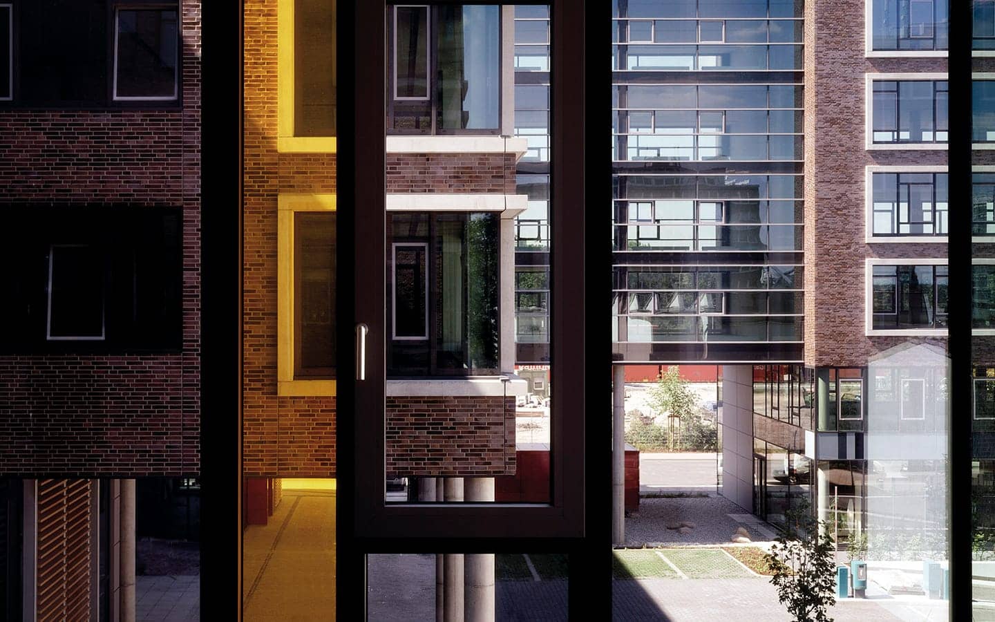Die Verwendung von Klinker als wesentlichem Fassadenmaterial in Verbindung mit Glas und Betonlisenen prägt das äußere Erscheinungsbild. Die Eingangszonen wurden zur Adressenbildung farblich akzentuiert.
