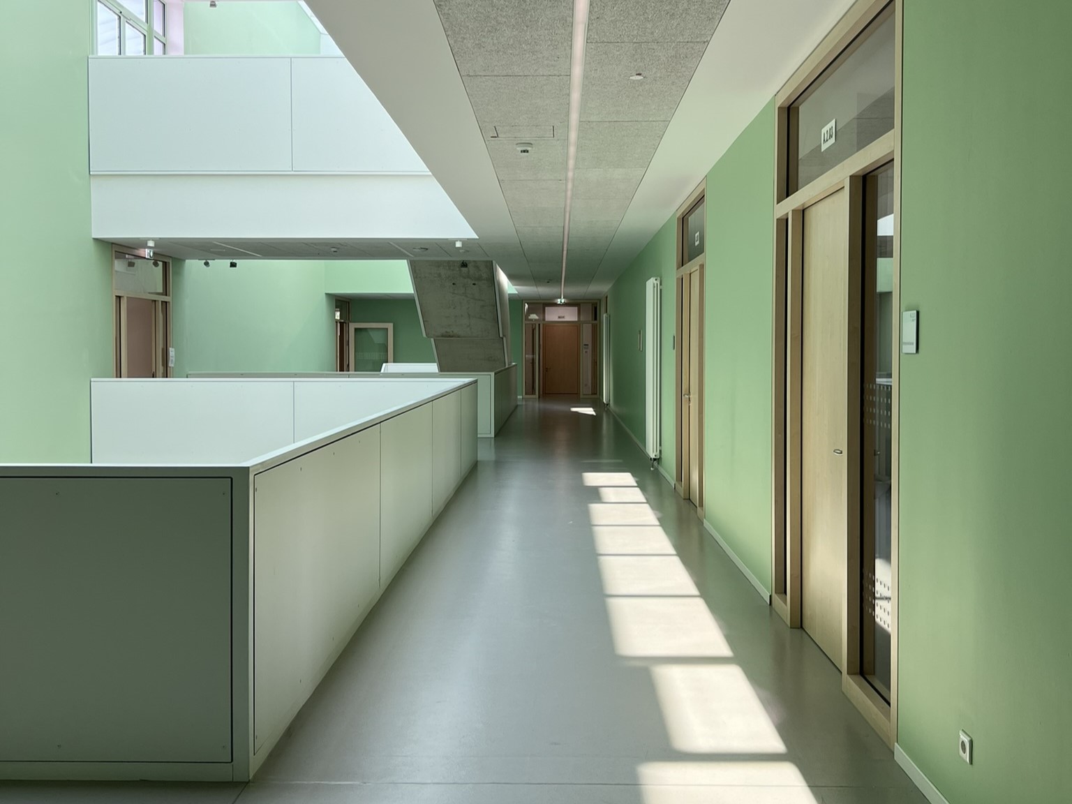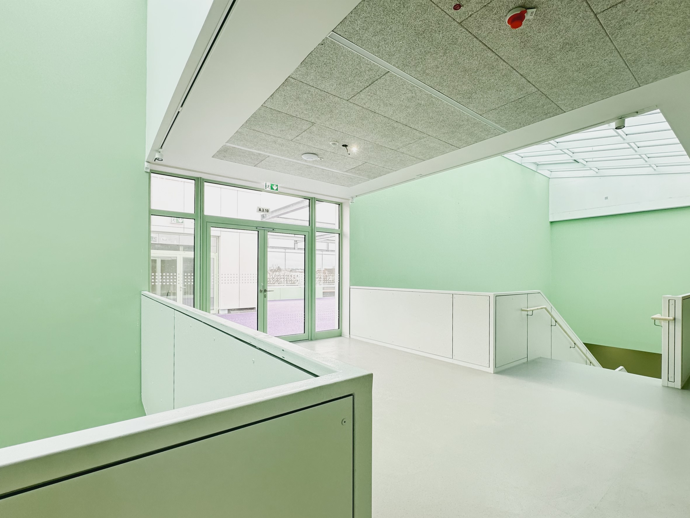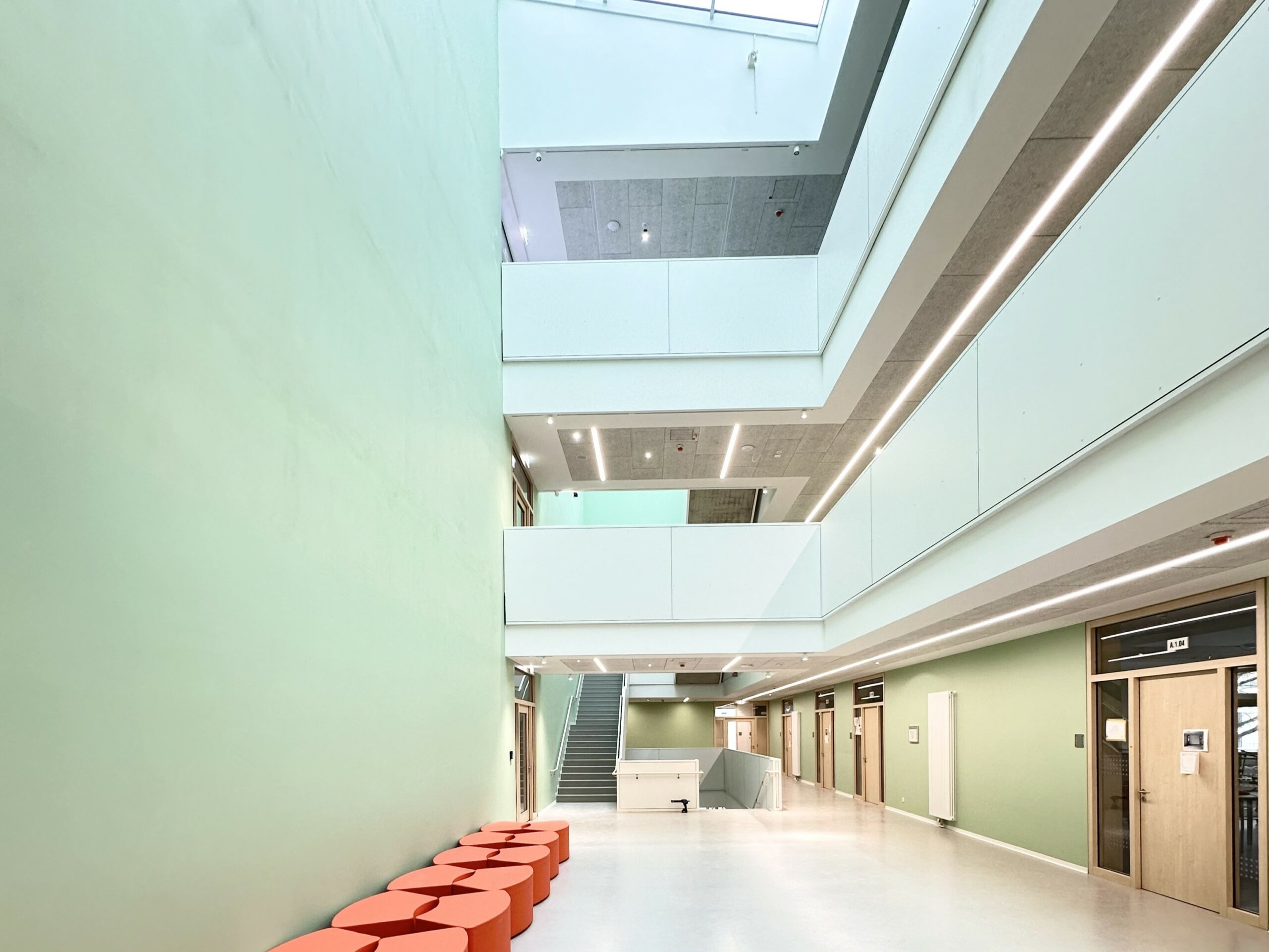 Das einheitliche Farbkonzept setzt sich auch in den Innenbereichen fort. So finden sich beispielsweise die weiß-grünen Farbakzente der Fensterrahmen an allen Wänden der geschossübergreifenden Halle der Schule wieder. Insbesondere im Innenbereich wurde großer Wert auf die Wahl von nachhaltigen, emissionsarmen und insbesondere langlebigen Materialien gelegt.