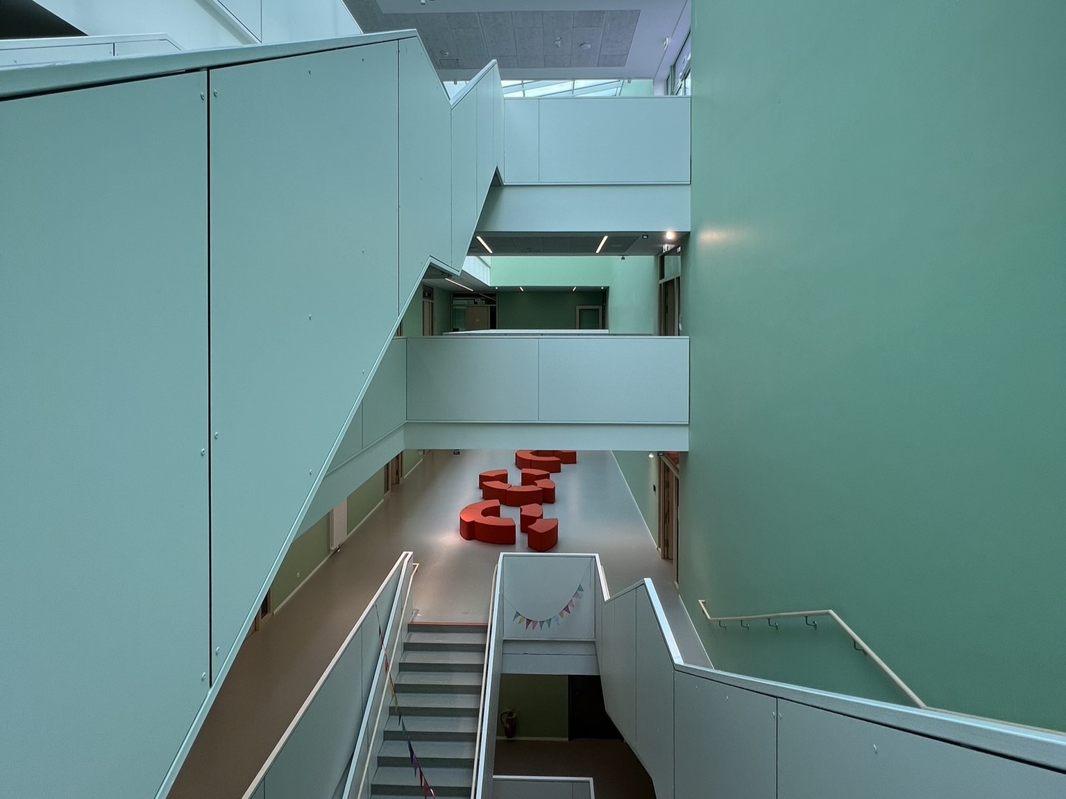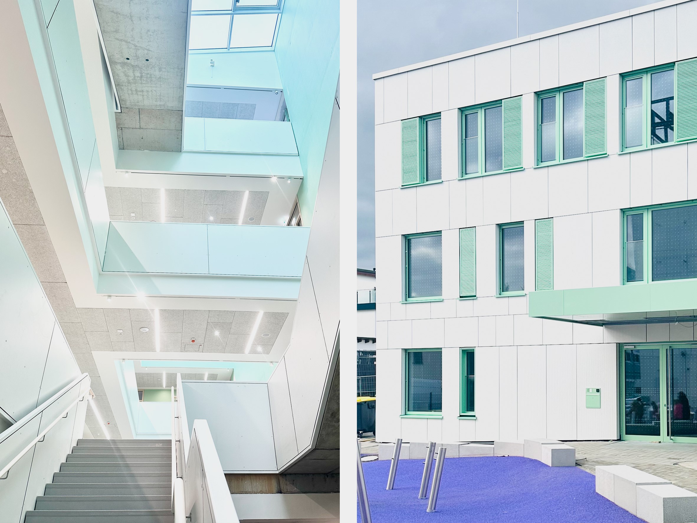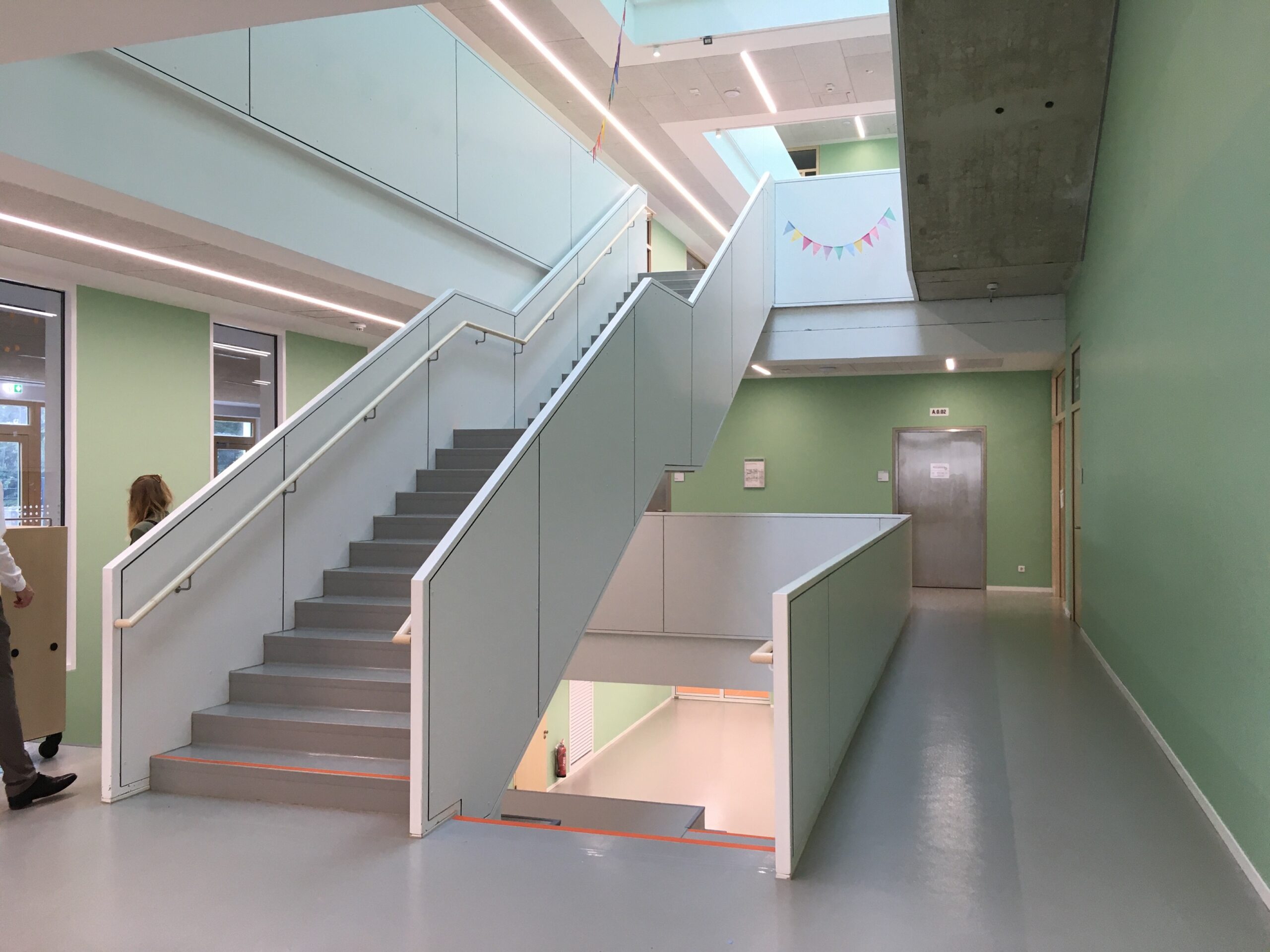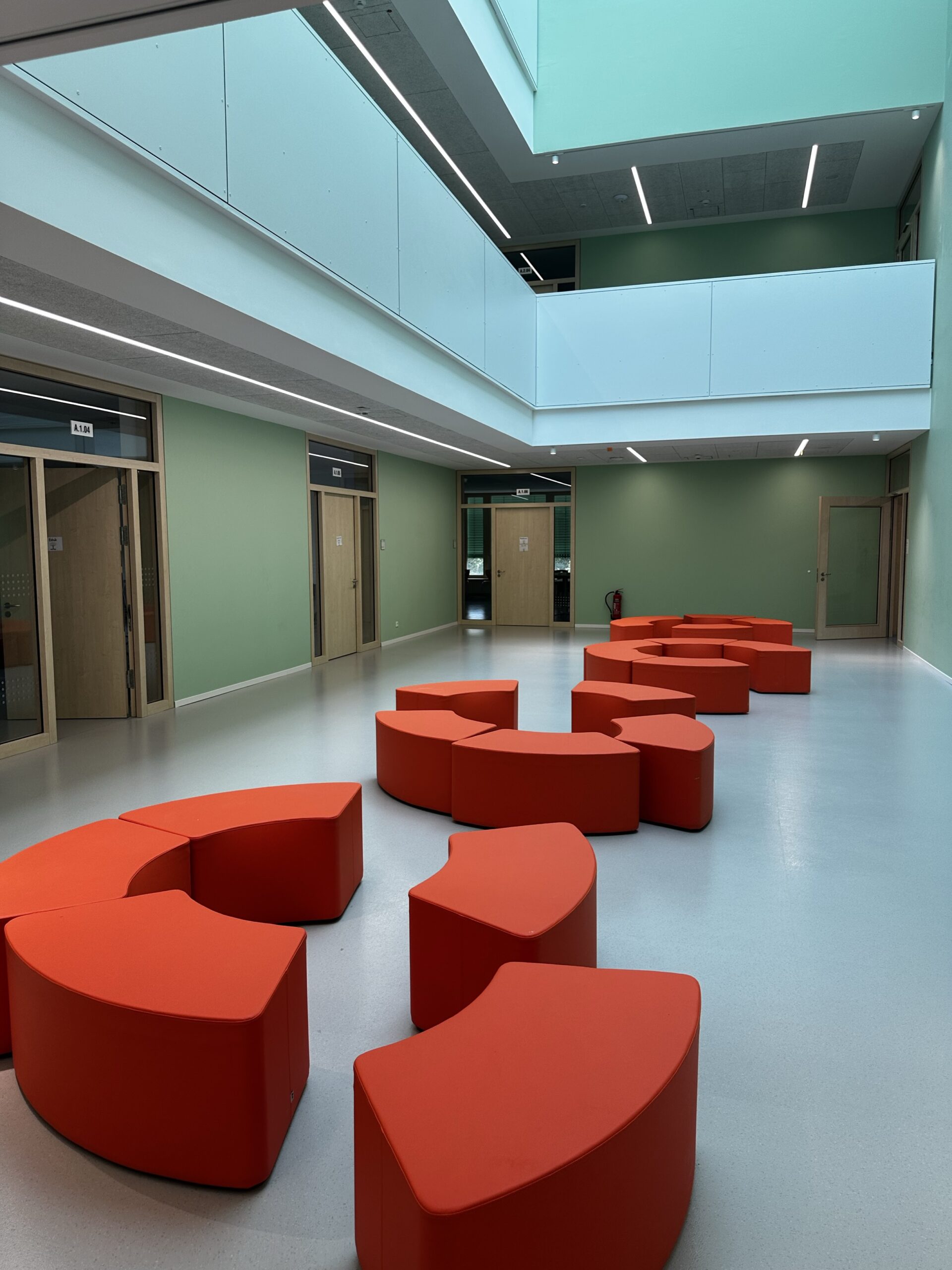 Das einheitliche Farbkonzept setzt sich auch in den Innenbereichen fort. So finden sich beispielsweise die weiß-grünen Farbakzente der Fensterrahmen an allen Wänden der geschossübergreifenden Halle der Schule wieder. Insbesondere im Innenbereich wurde großer Wert auf die Wahl von nachhaltigen, emissionsarmen und insbesondere langlebigen Materialien gelegt.