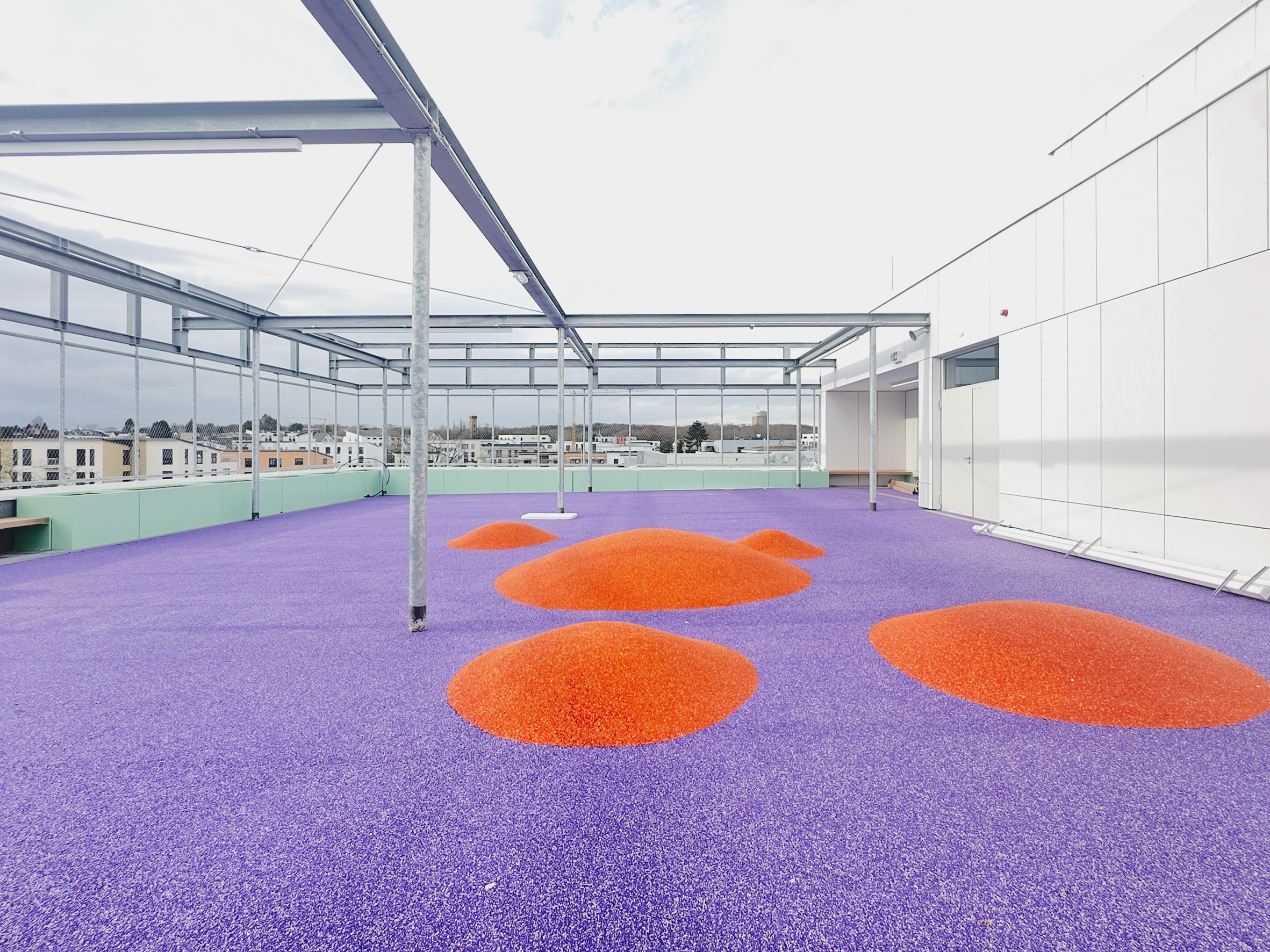 Aufgrund des geringen Baufeldes musste die überbaute Grundstücksfläche so gering wie möglich ausfallen, damit die vorgegebenen Flächen für den Außenspielbereich der Kindertagesstätte und des Schulhofes eingehalten werden konnten. Die Konsequenz daraus war, dass innerhalb der Gebäude einzelne Nutzungsbereiche intelligent gestapelt werden mussten. Deshalb ist u.a. im Schulgebäude die Sporthalle im Untergeschoss und auf dem Dach ein Schulhof verortet.
