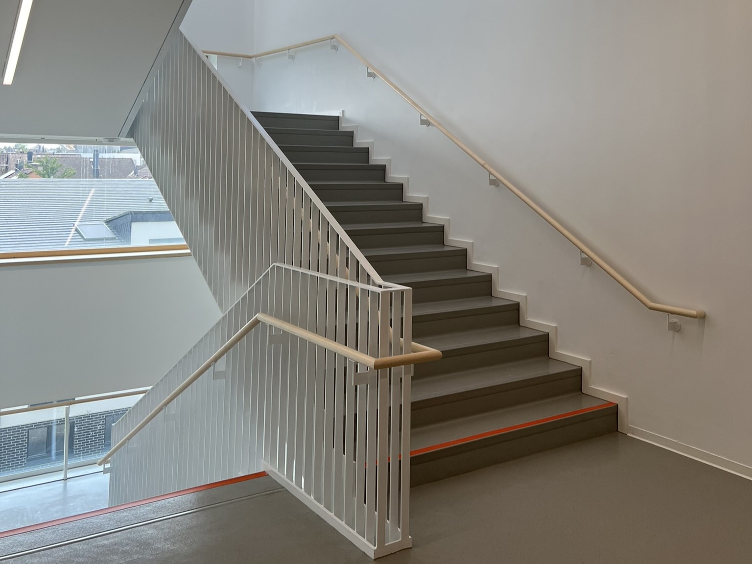 Über den Eingangsbereich im Erdgeschoss gelangt man fließend in die tageslichtgeflutete geschossübergreifende Halle, die als vertikale Orientierungsachse in das Unter- und in die Obergeschosse führt und mit dem Mehrzweckraum im 1.Obergeschoss das Herz der Schule ausbildet.