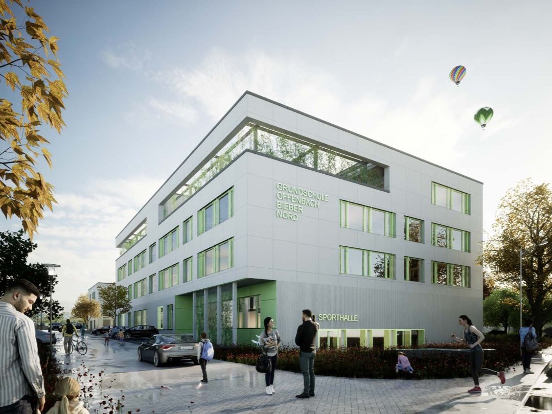 Die städtebauliche Figur besteht aus zwei klar voneinander getrennten gegenüberliegenden Baukörpern: einer 3-geschossigen Kindertagesstätte und einer 4-geschossigen Grundschule. Diese kompakten Baukörper korrespondieren in ihrer Erscheinung mit der Wohnbebauung in ihrer unmittelbaren Umgebung. Sie nehmen deren Raumkanten auf und reagieren auf deren Höhenstaffelung. Das viergeschossige Schulgebäude im Osten bildet hierbei das Entre bzw. den Abschluss zum Stadtteilpark und öffnet sich über einen Tiefhof mit Treppen-/Rampenanlage zur Haupterschließungsstraße. Die Fläche zwischen Kindertagesstätte und Grundschule dient als Erschließungshof und ist somit ein wichtiges Bindeglied.