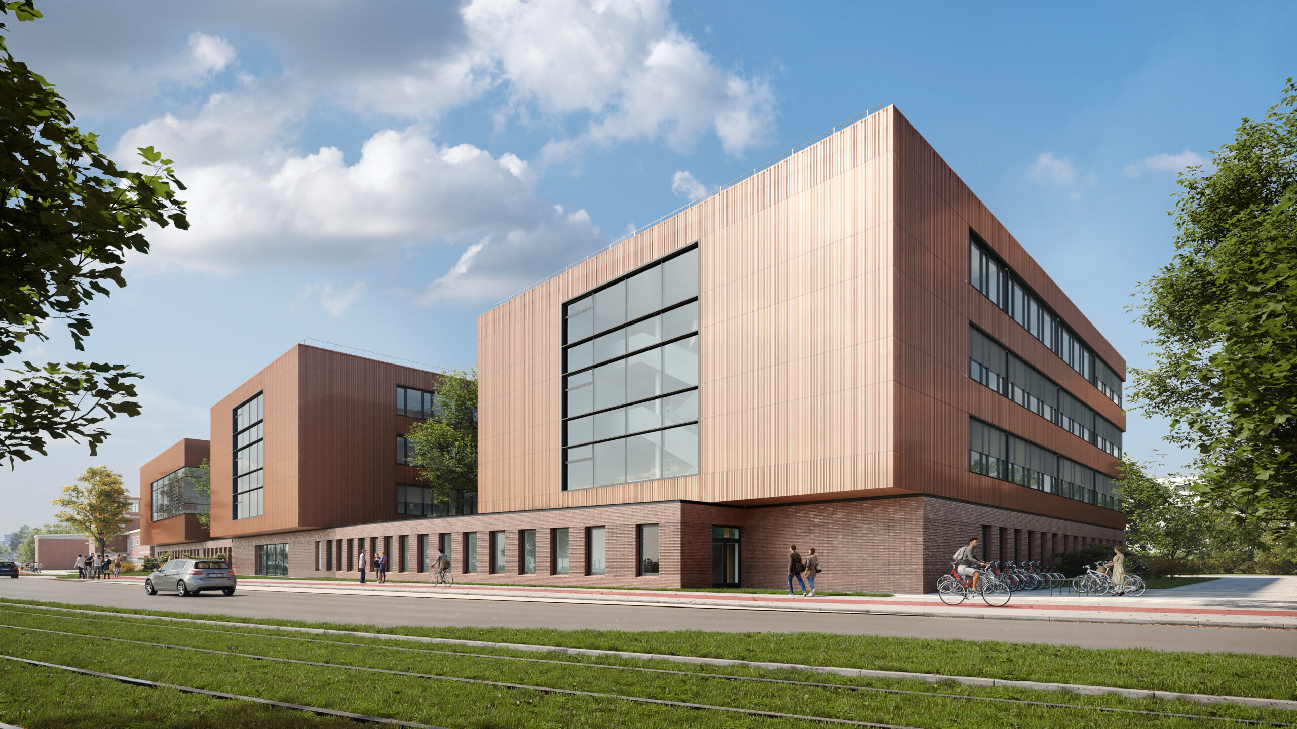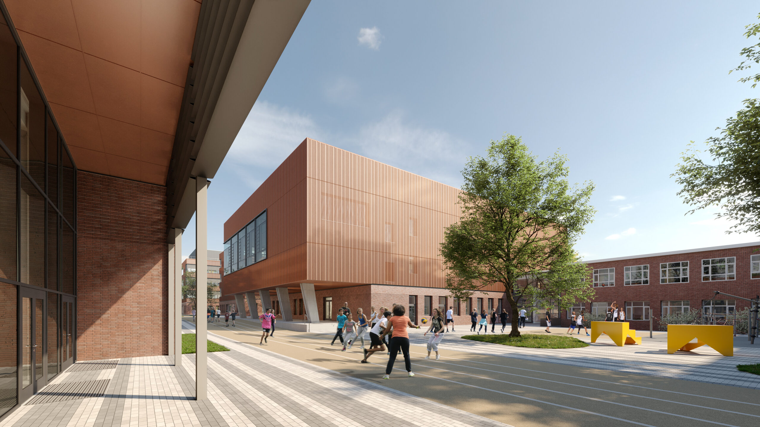Von hier ist sowohl der Altbau als auch der Sportbereich direkt zu erreichen. Zudem wird eine direkte Erschließung des Sportbereichs auch außerhalb der Schulöffnungszeiten ermöglicht. Es entstehen qualitätsvolle und von außen geschützte Schulhofflächen, die dem Standort die Würde eines Wissenscampus verleiht.