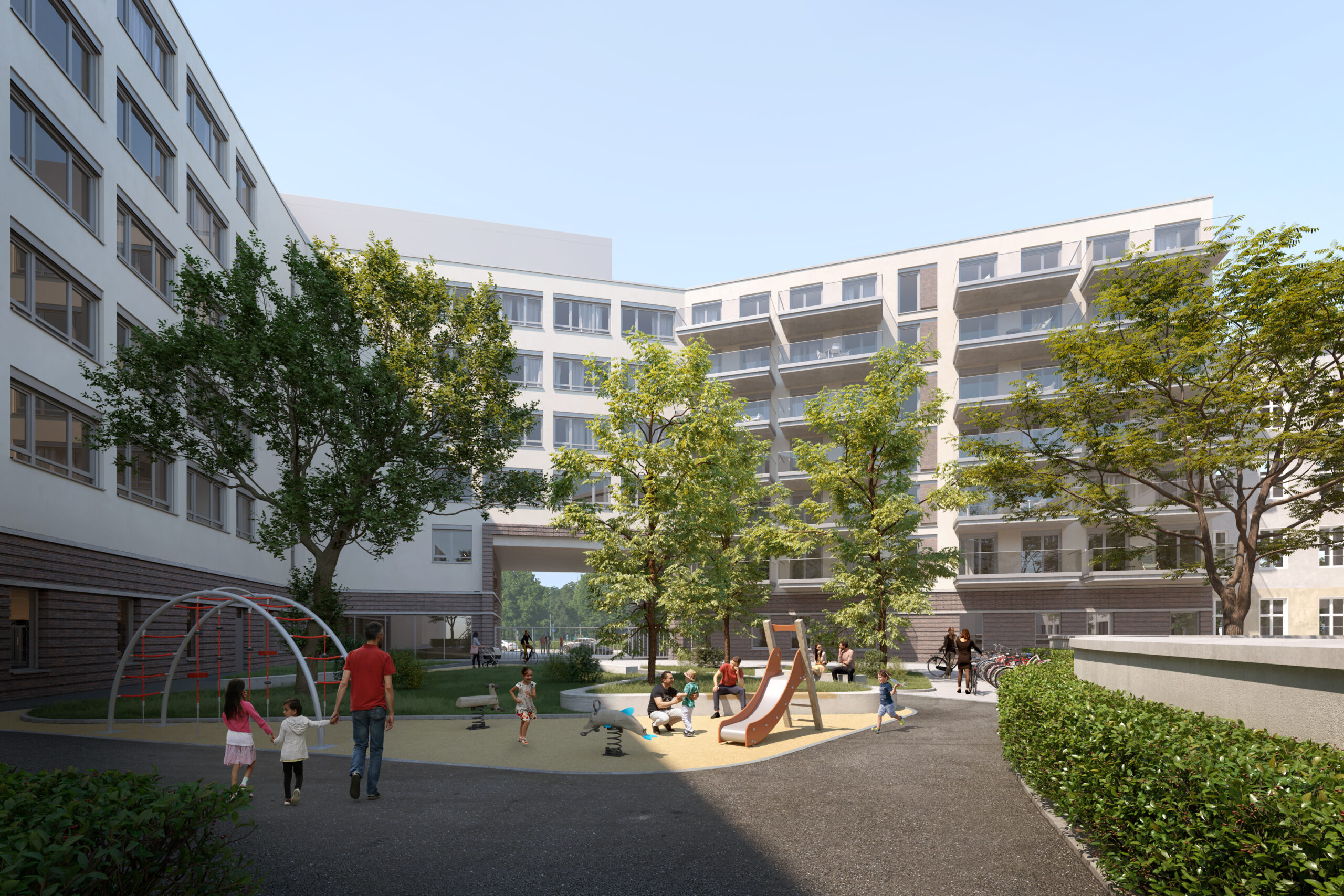 Das Gebäude wird unterschiedliche Nutzungen beherbergen. Dazu zählt ein Sockelgeschoss mit Gewerbeeinheiten, die flexibel gestaltet werden können, sowie Büroflächen im westlichen Teil, die über ein zentrales Treppenhaus und eine Doppelaufzugsanlage erschlossen werden. Außerdem entstehen 24 barrierefreie Wohneinheiten im nordöstlichen Teil, orientiert zum begrünten Innenhof mit Balkonen.