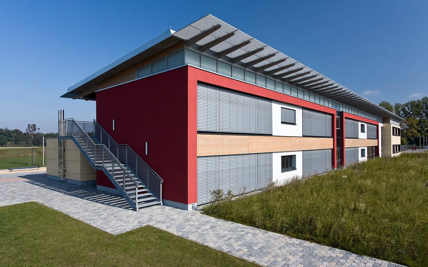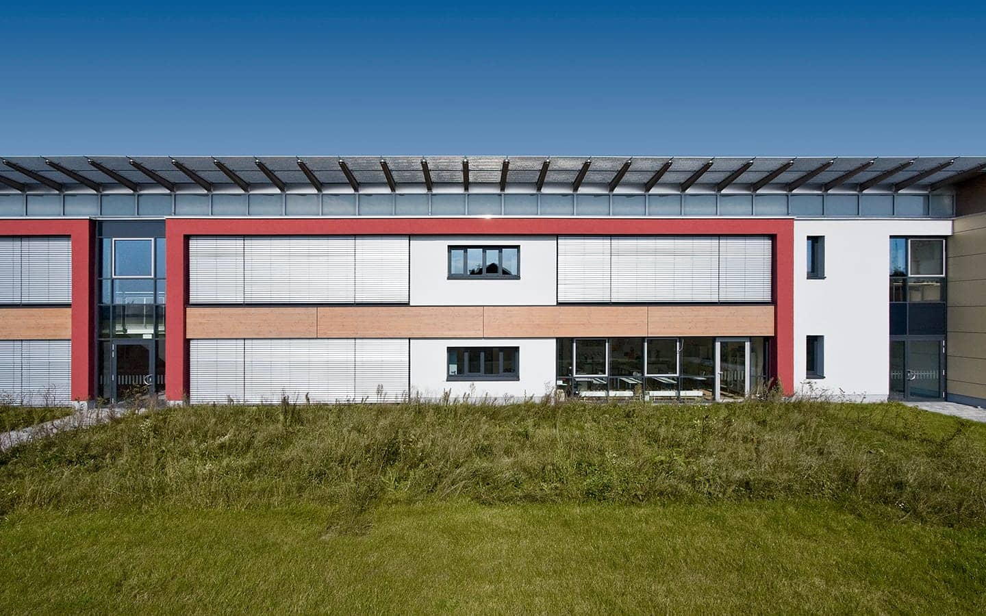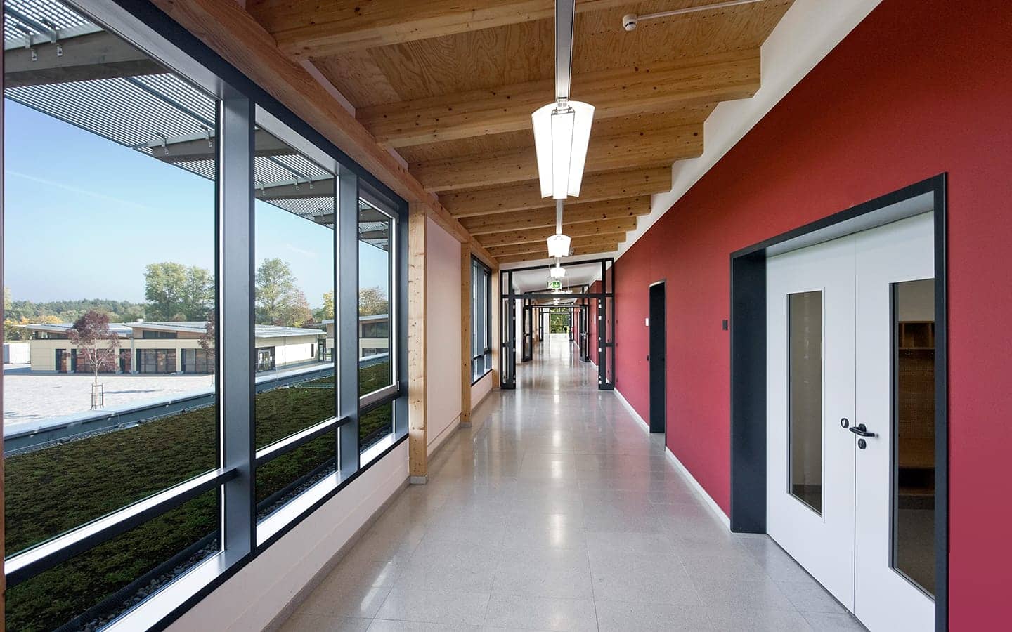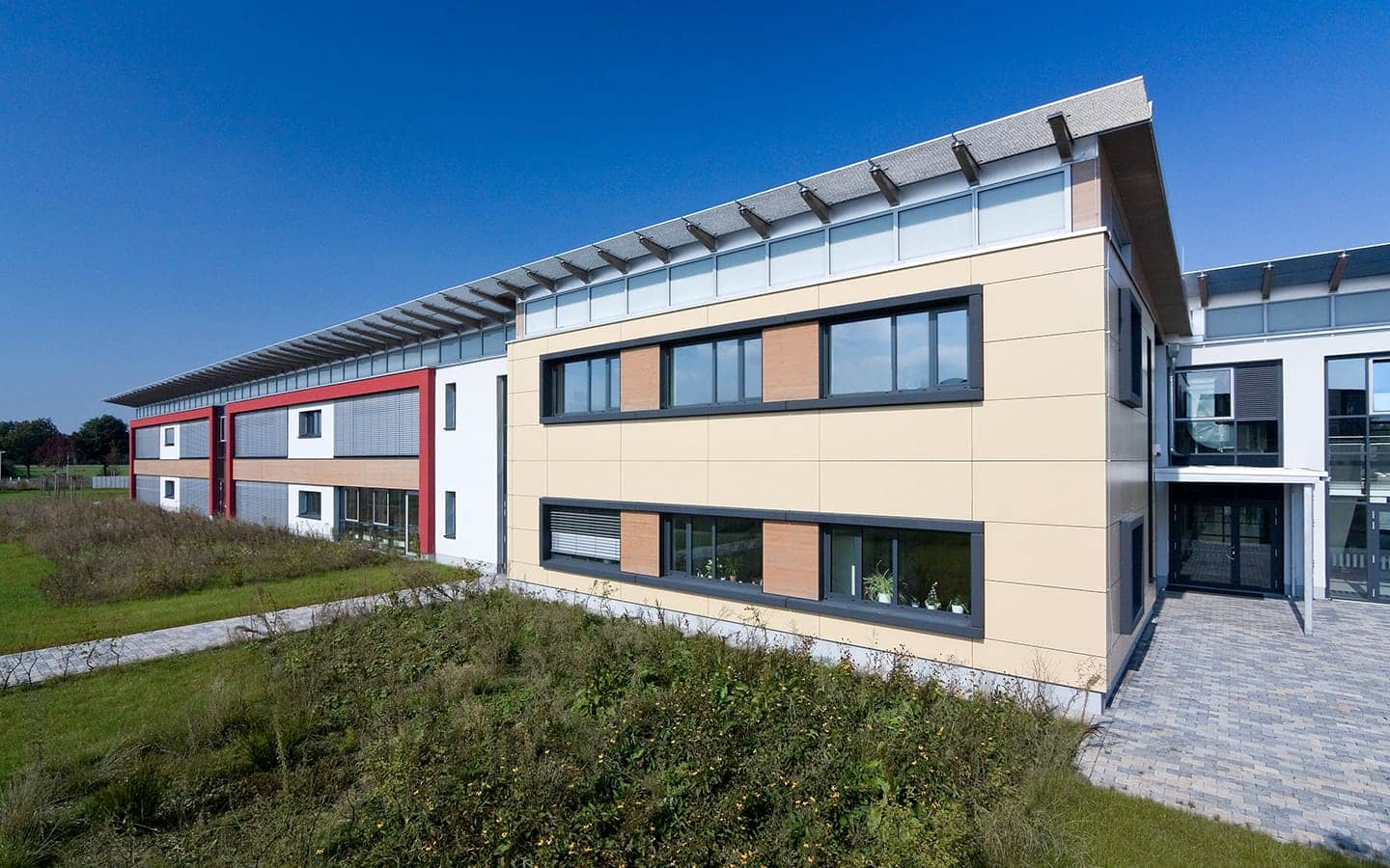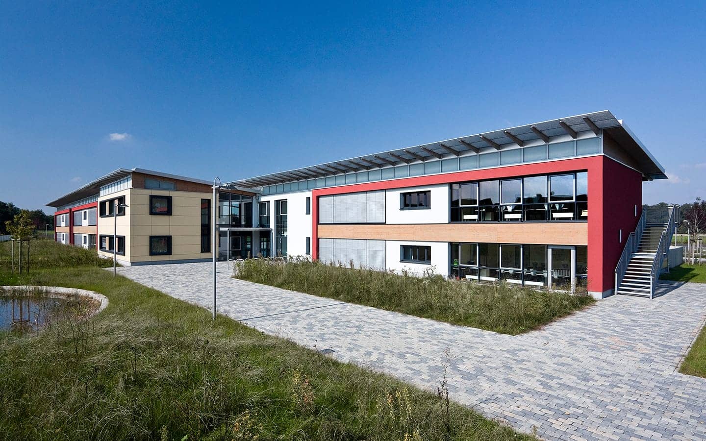 Der Schulbaukörper ist Nord – Süd ausgerichtet und setzt sich aus einem eingeschossigen Nebenraumriegel (Flachdach) im Norden und einem zweigeschossigen Klassenraumriegel (Pultdach) im Süden zusammen. Klare Bereichszuordnungen, gute Orientierung und Lichtführung schaffen individuelle Raumqualität und zeichnen das Schulgebäude aus.
