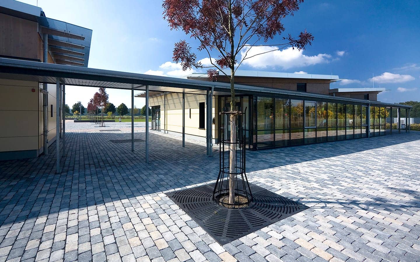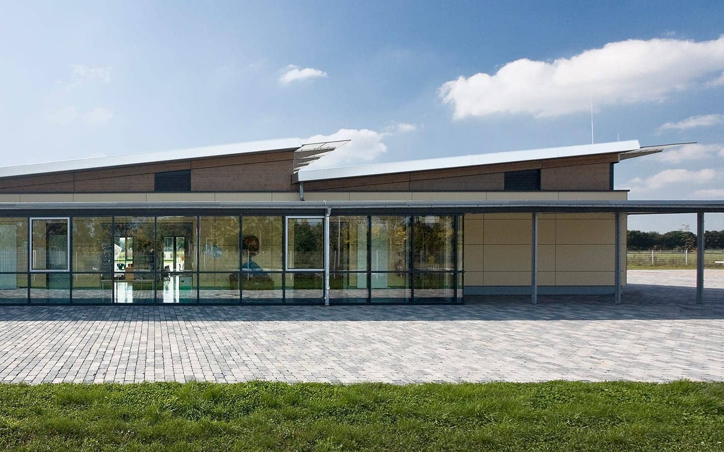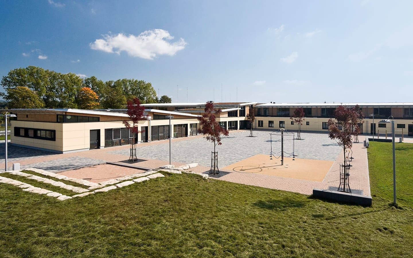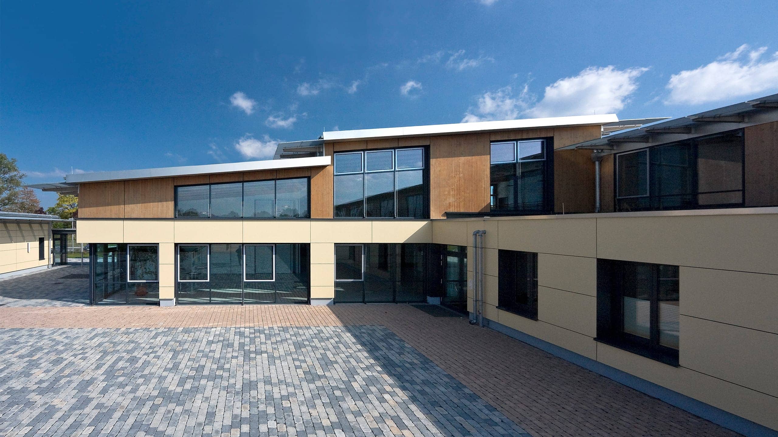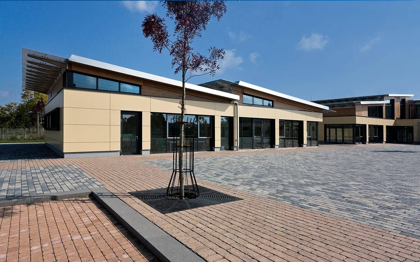 Der Schulbaukörper ist Nord – Süd ausgerichtet und setzt sich aus einem eingeschossigen Nebenraumriegel (Flachdach) im Norden und einem zweigeschossigen Klassenraumriegel (Pultdach) im Süden zusammen. Klare Bereichszuordnungen, gute Orientierung und Lichtführung schaffen individuelle Raumqualität und zeichnen das Schulgebäude aus.