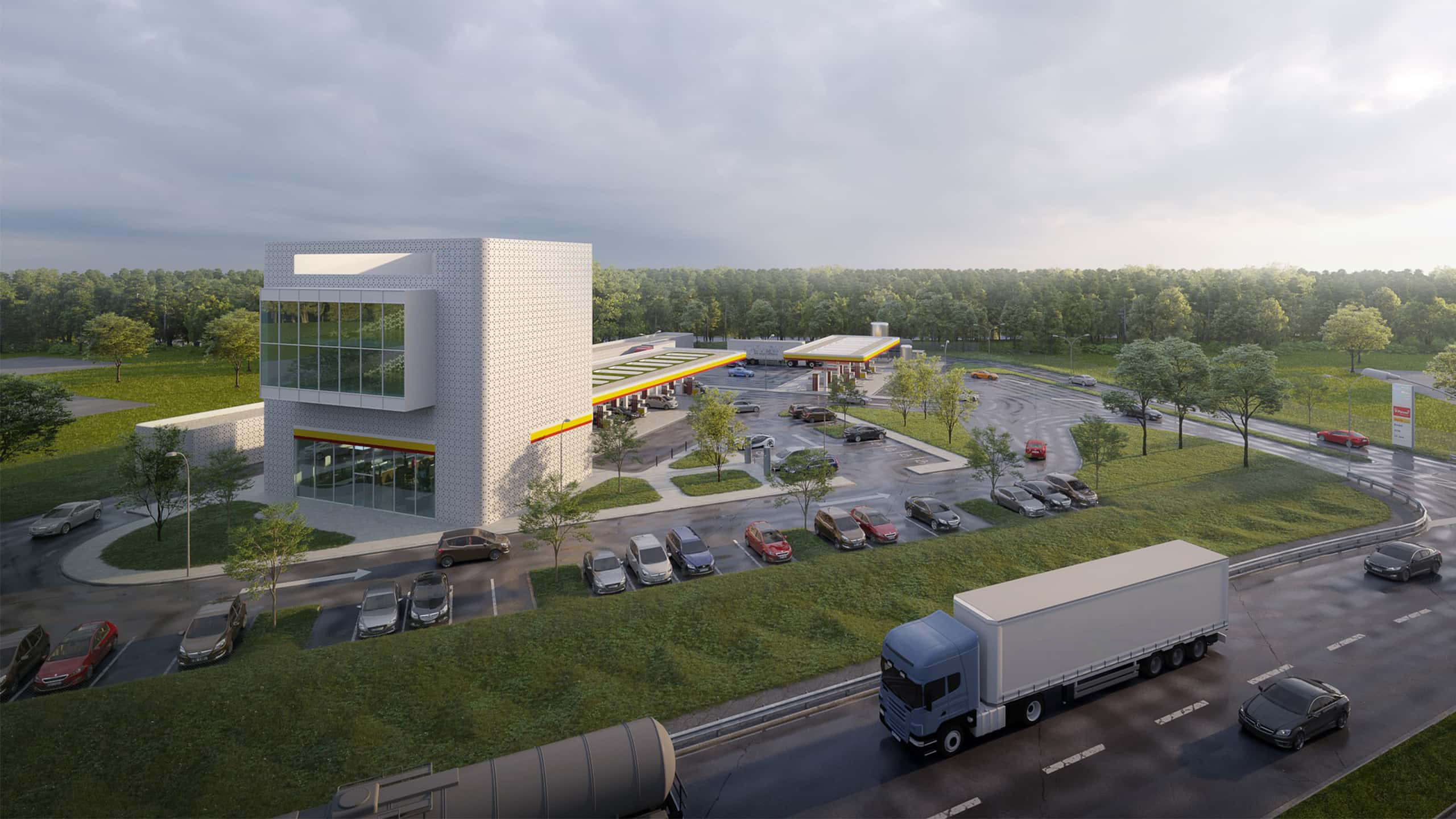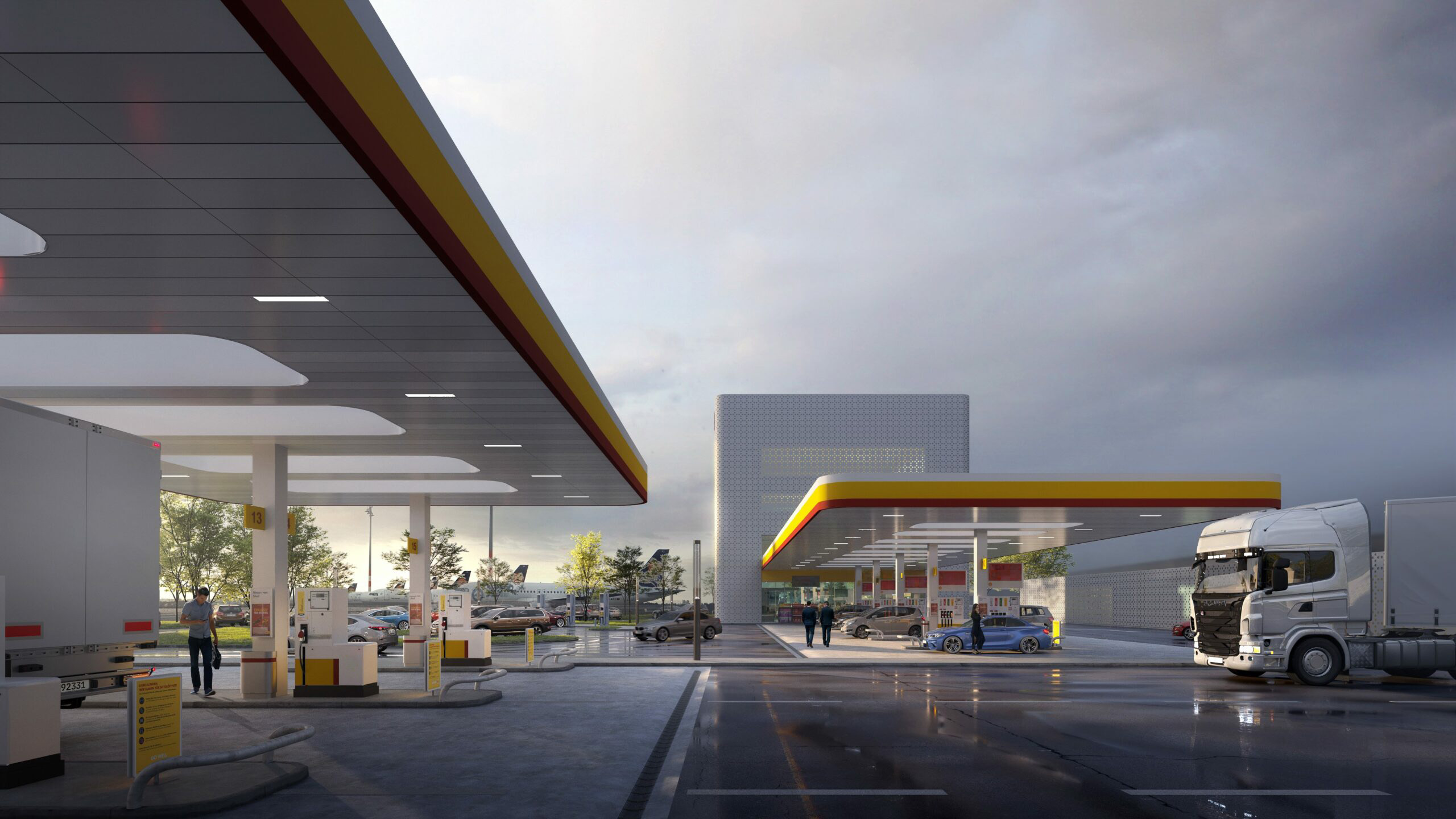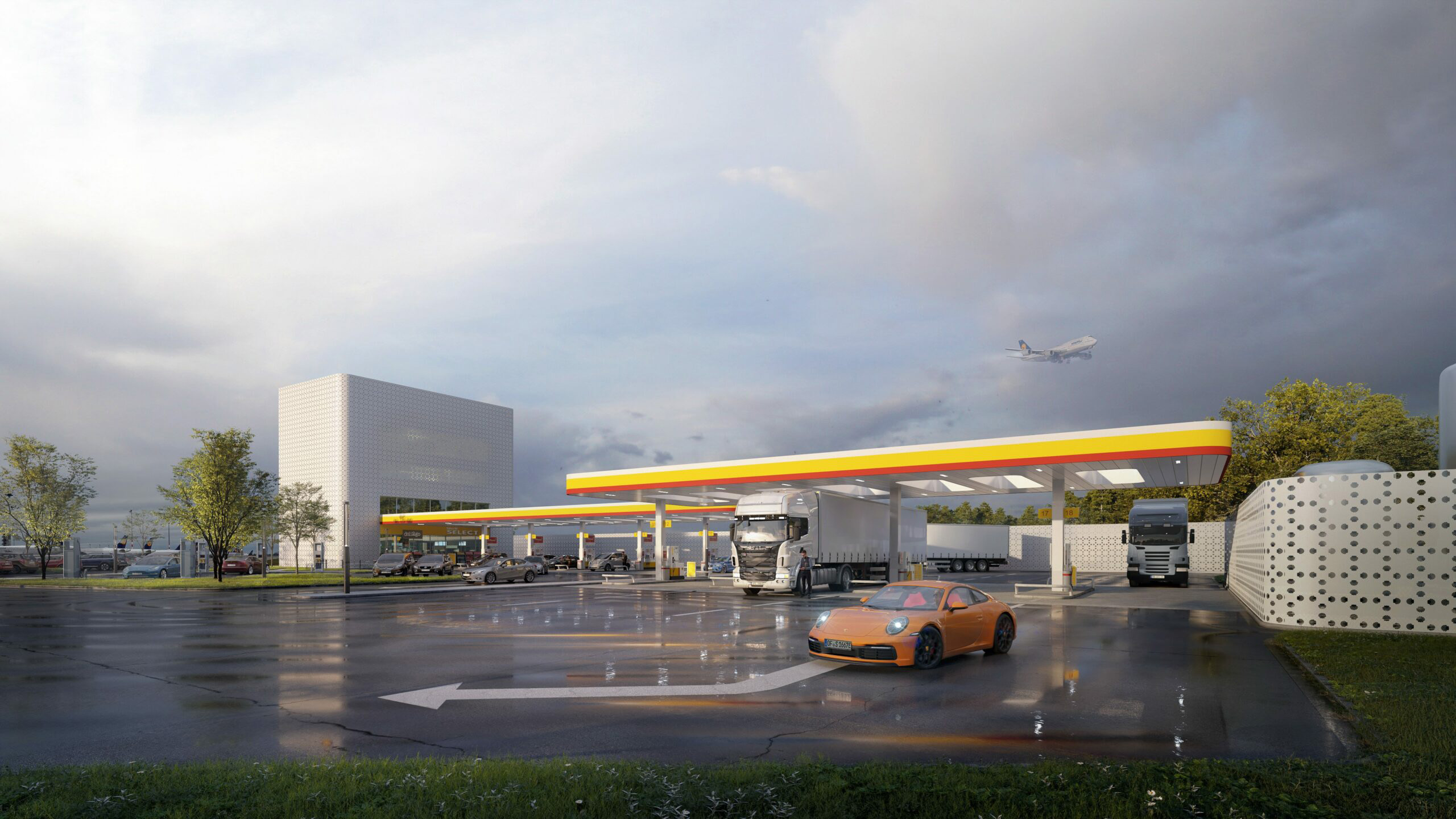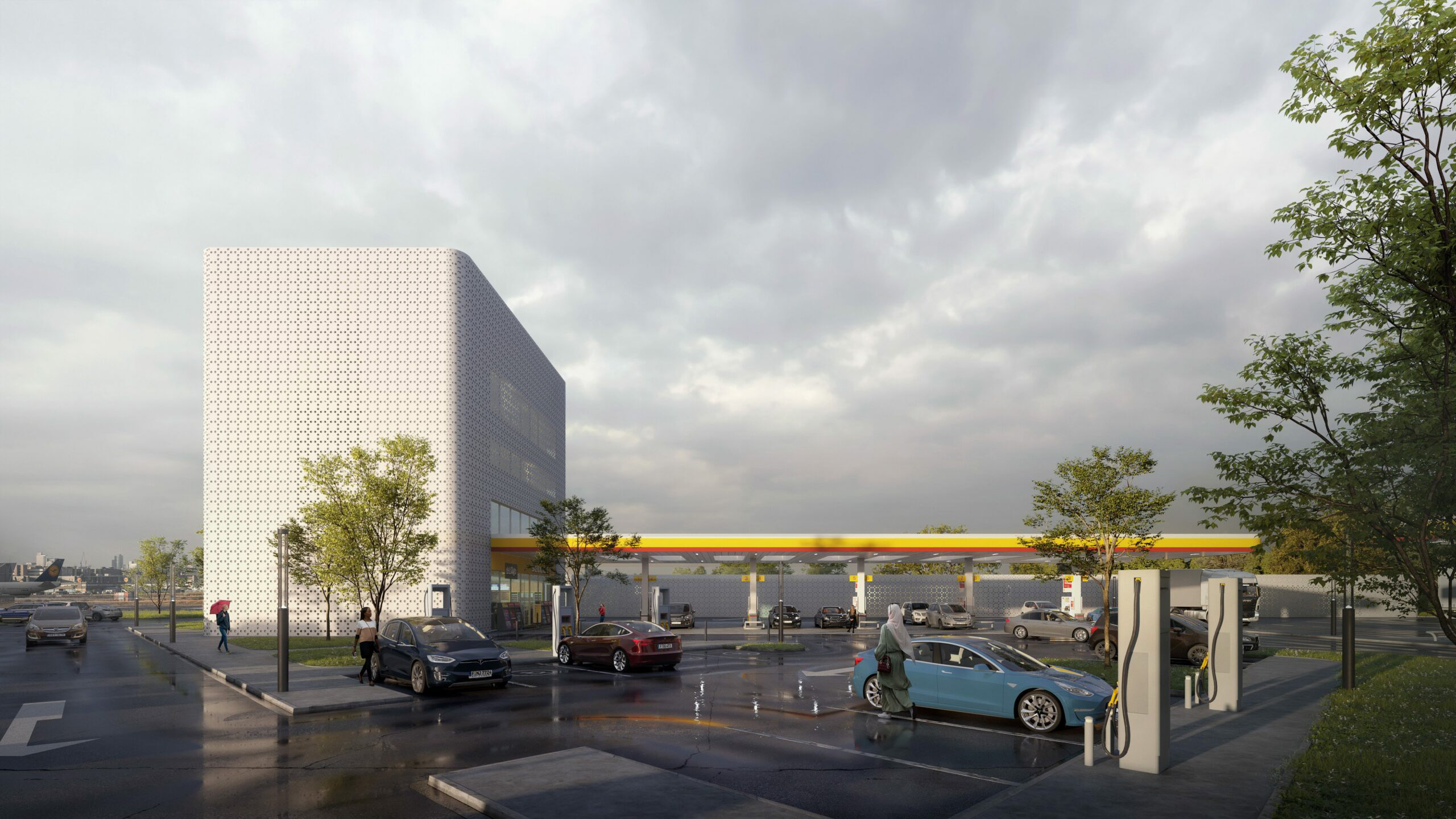 Die Konzeptstudie soll eine Tankstelle der Zukunft an einem wichtigen Mobilitätsknoten außerhalb der Stadt zum Beispiel in der Nähe eines internationalen Flughafens darstellen.
