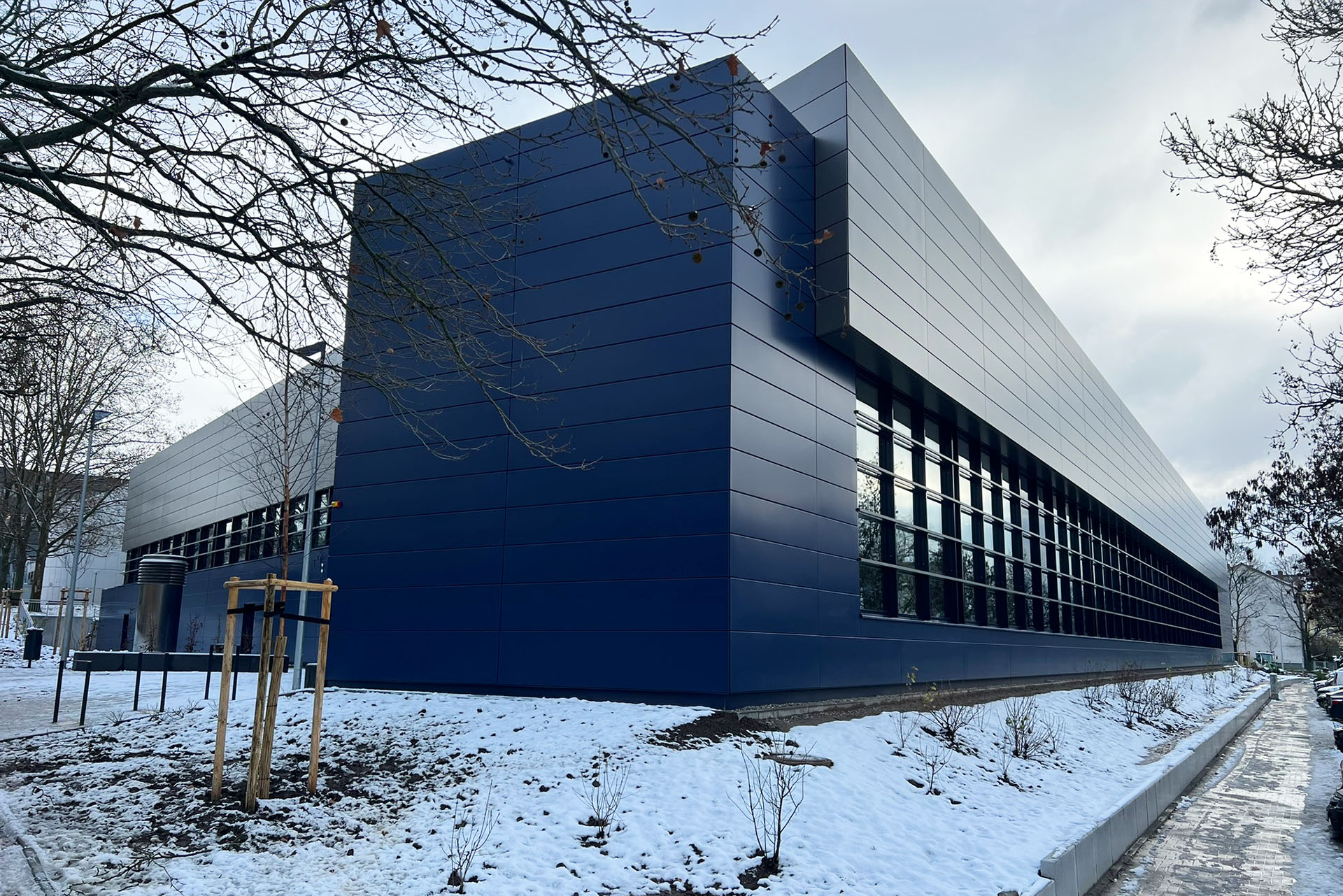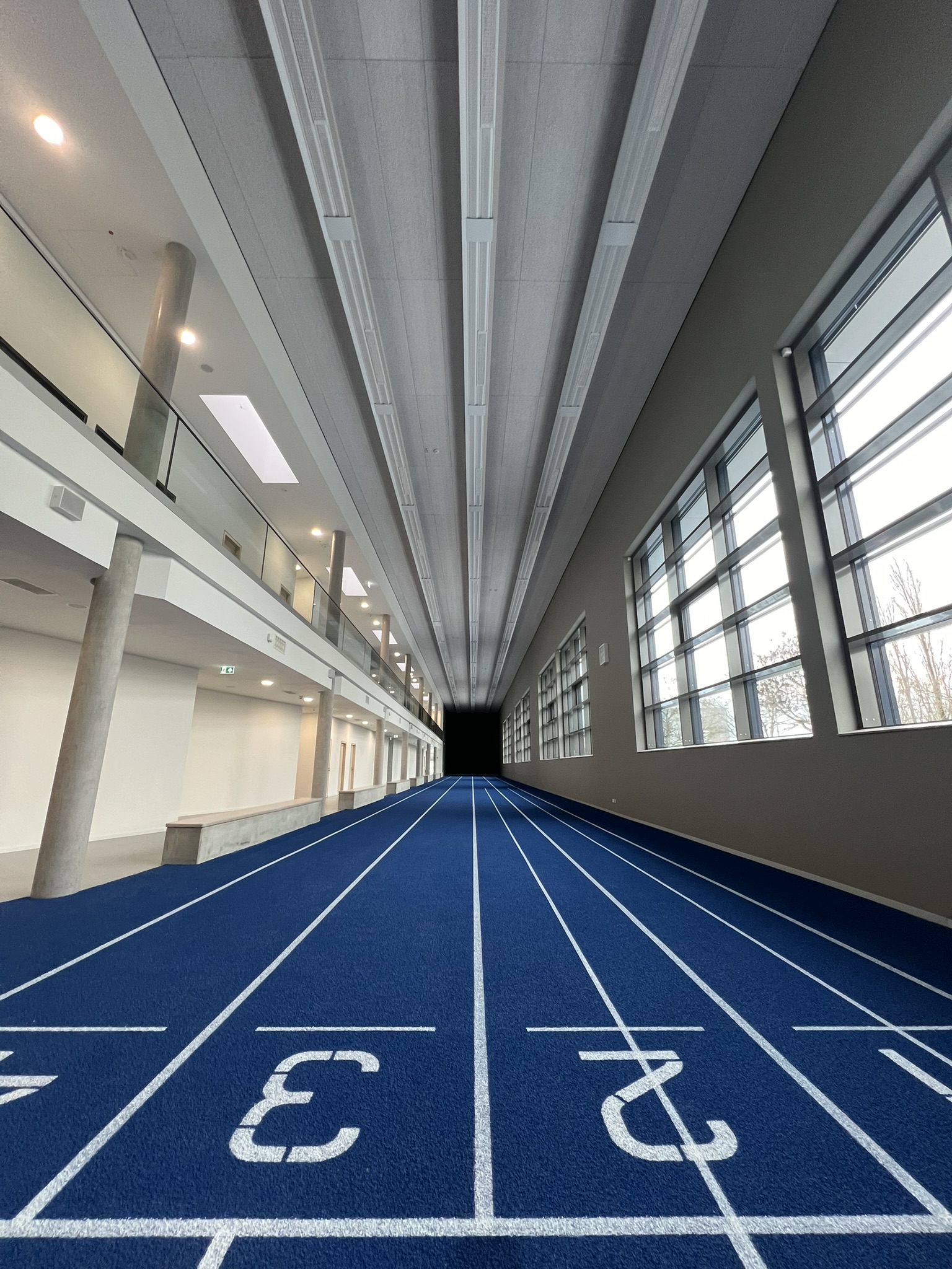 Die Gebäudeidee ist die Erlebbarkeit eines gemeinsamen Ortes für Schul-und Vereinssport, Training und Talentförderung. Über die beiden Zugänge wird man in einem offenen Haus in der Mittelachse des Gebäudes empfangen, das über die offene Leichtathletikhalle visuell mit dem Obergeschoss verbunden ist und über Fensterflächen belichtet wird. In räumlicher Nähe befinden sich die Zugänge zur Sporthalle, zur Turnhalle und der Funktionsbereiche. Besucher, Sportler und Lehrer können im Erdgeschoss und Obergeschoss, die sportlichen Aktivitäten auf Zuschauerbänken verfolgen. Eine weitere breiter ausgebildete Raumzone im Obergeschoss dient dem Aufenthalt, der Verpflegung und bietet Platz für Lerngruppen. Davon räumlich getrennt ist der Kraftraum mit Nebenräumen in diesem Geschoss vorgesehen. Alle Ebenen verbindender Aufzug gewährleistet die Barrierefreiheit aller Räume.