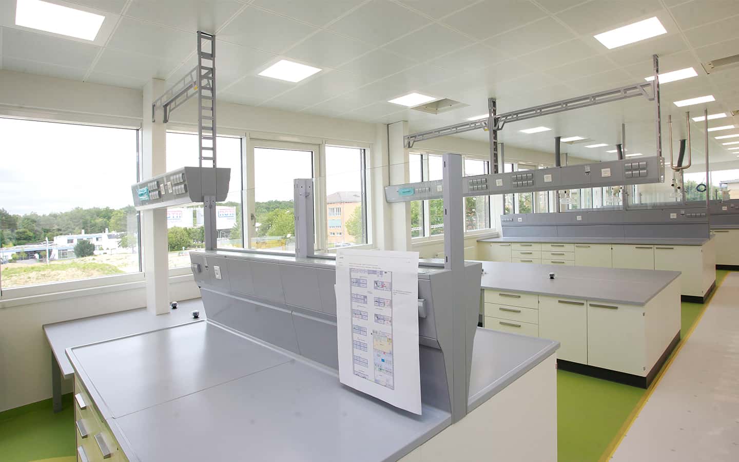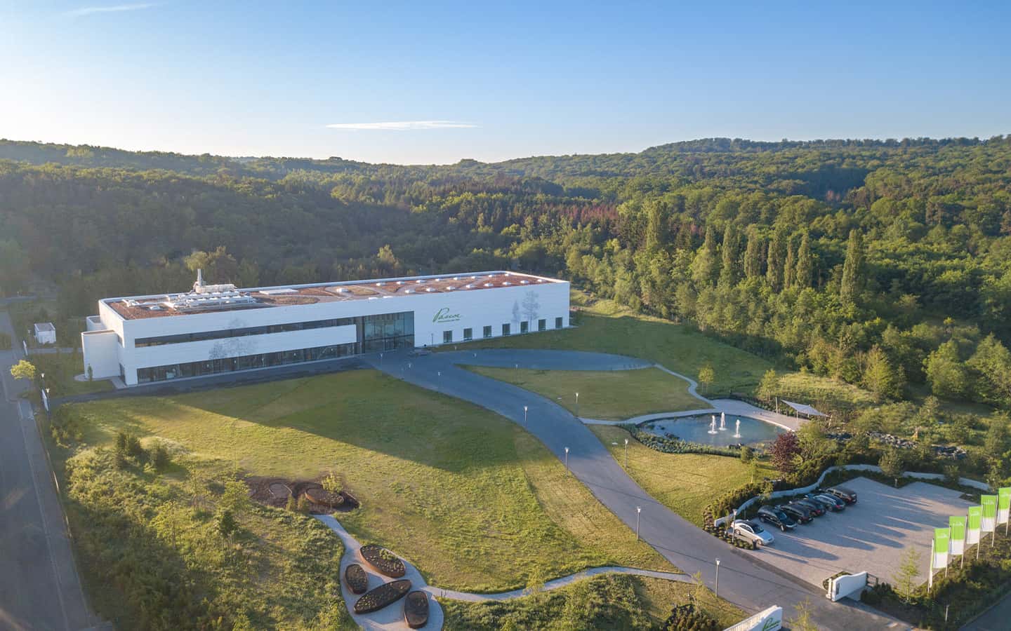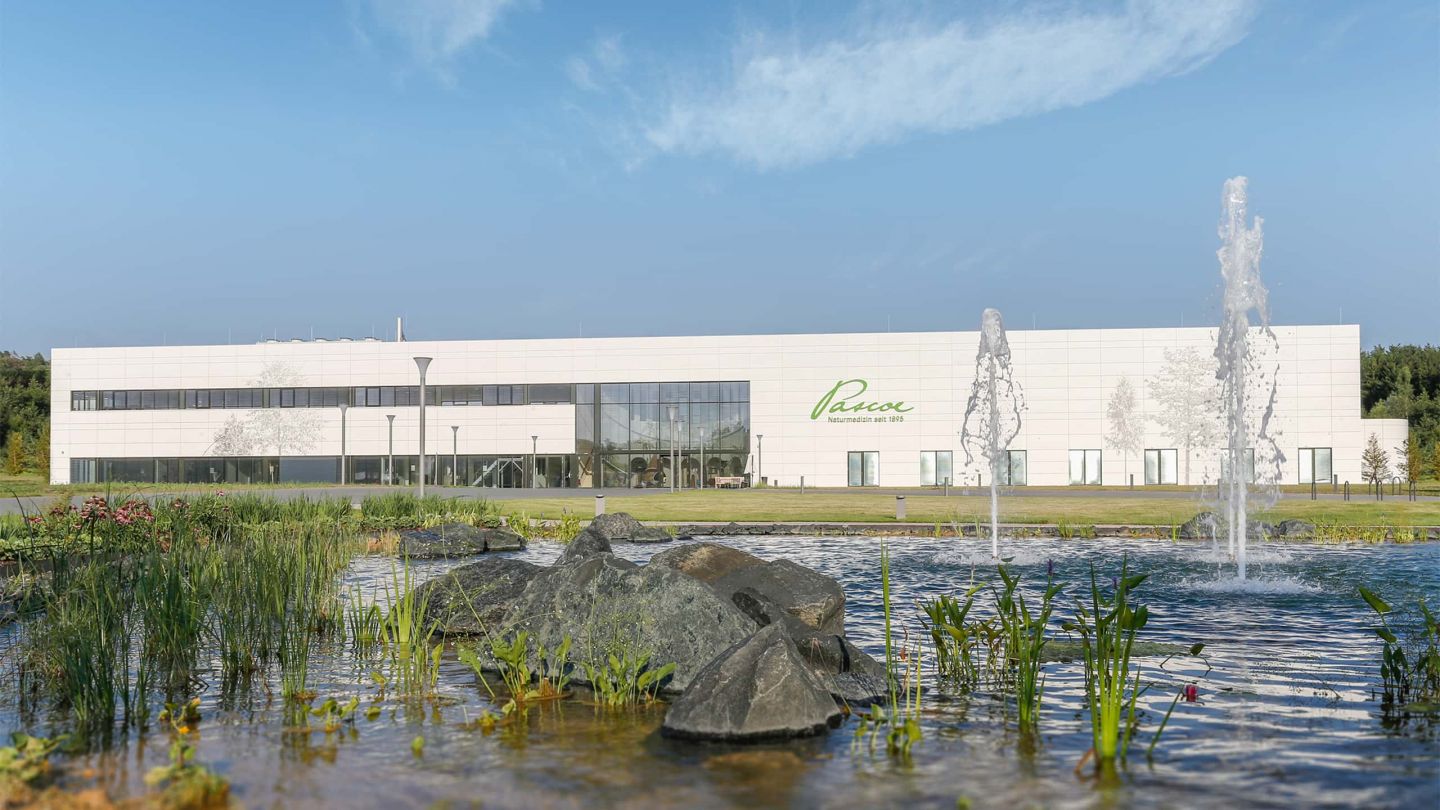 Im Erdgeschoss befindet sich die Produktion mit Reinräumen, ein zweigeschossiges Hochregallager sowie Sozialräume, Umkleiden, WCs und ein Pausenraum. Im Obergeschoss ist die Qualitätskontrolle sowie Labor- und Büroräume angesiedelt. Der 2-geschossige Eingangsbereich ist großzügig verglast und empfängt Angestellte und Besucher angemessen.