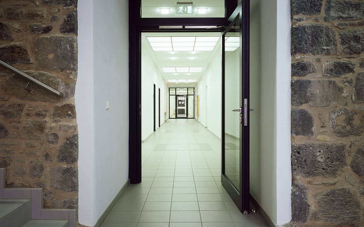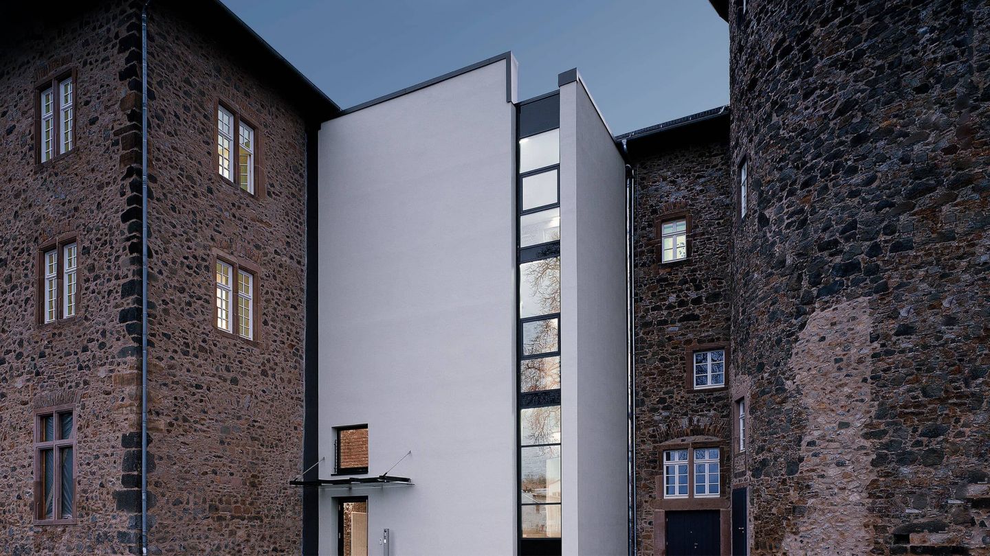 Beim Umbau des unter Denkmalschutz stehenden Schlosses aus dem 16. Jahrhundert zu einem Rathaus, wurden die vorgefundenen Zeitzeugnisse herausgearbeitet und in das neue Raumkonzept integriert. Die historischen Raumstrukturen konnten wieder aufgenommen werden. Die vertikale Erschließung durch ein neues Treppenhaus wurde im kontrastreichen Spannungsfeld zwischen historischer und zeitgenössischer Architektur als Gelenk im Fassadenbereich ausgebildet.