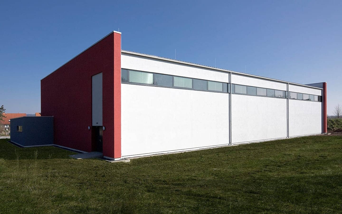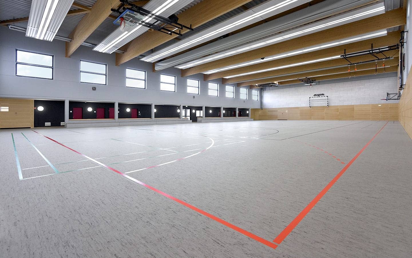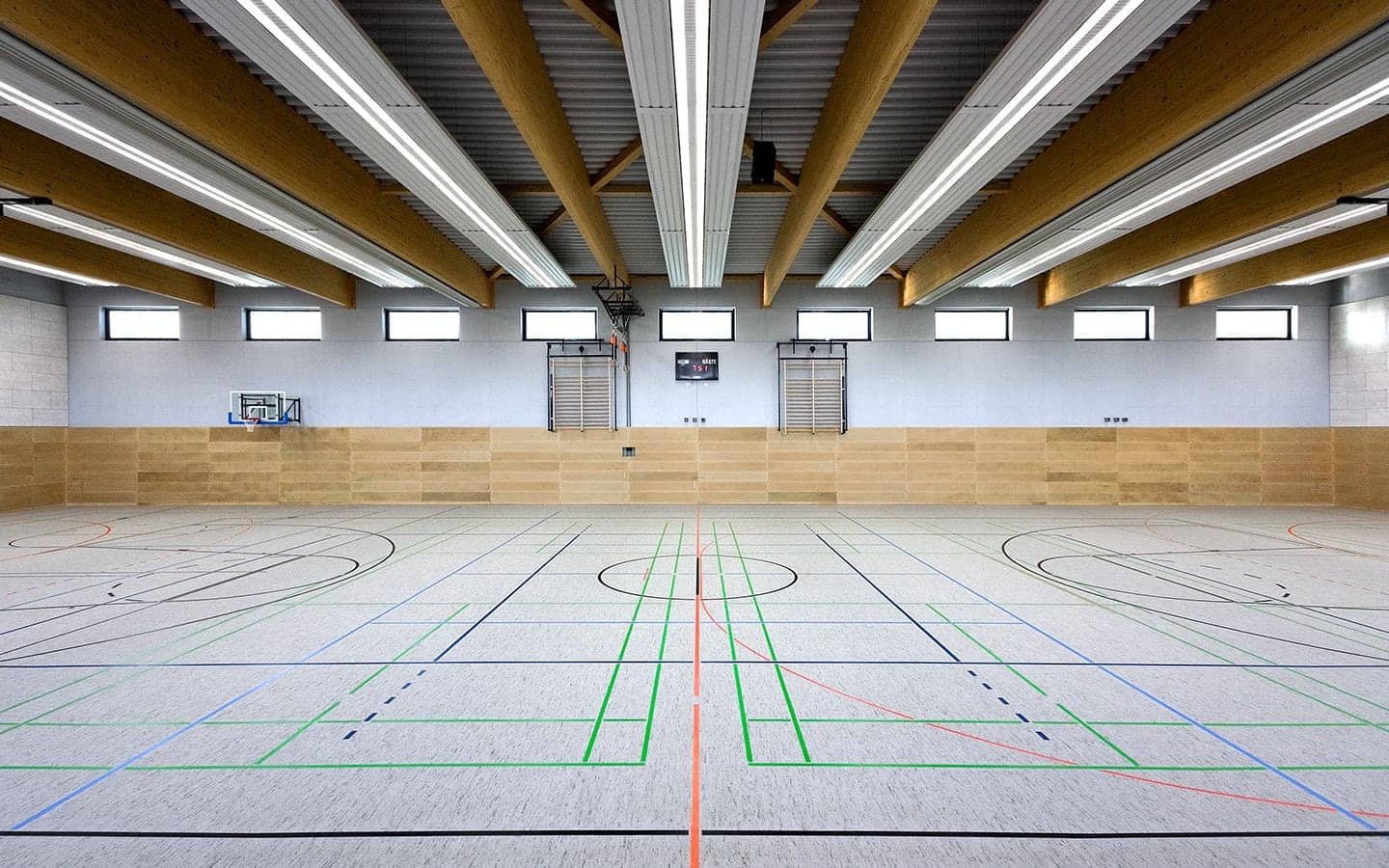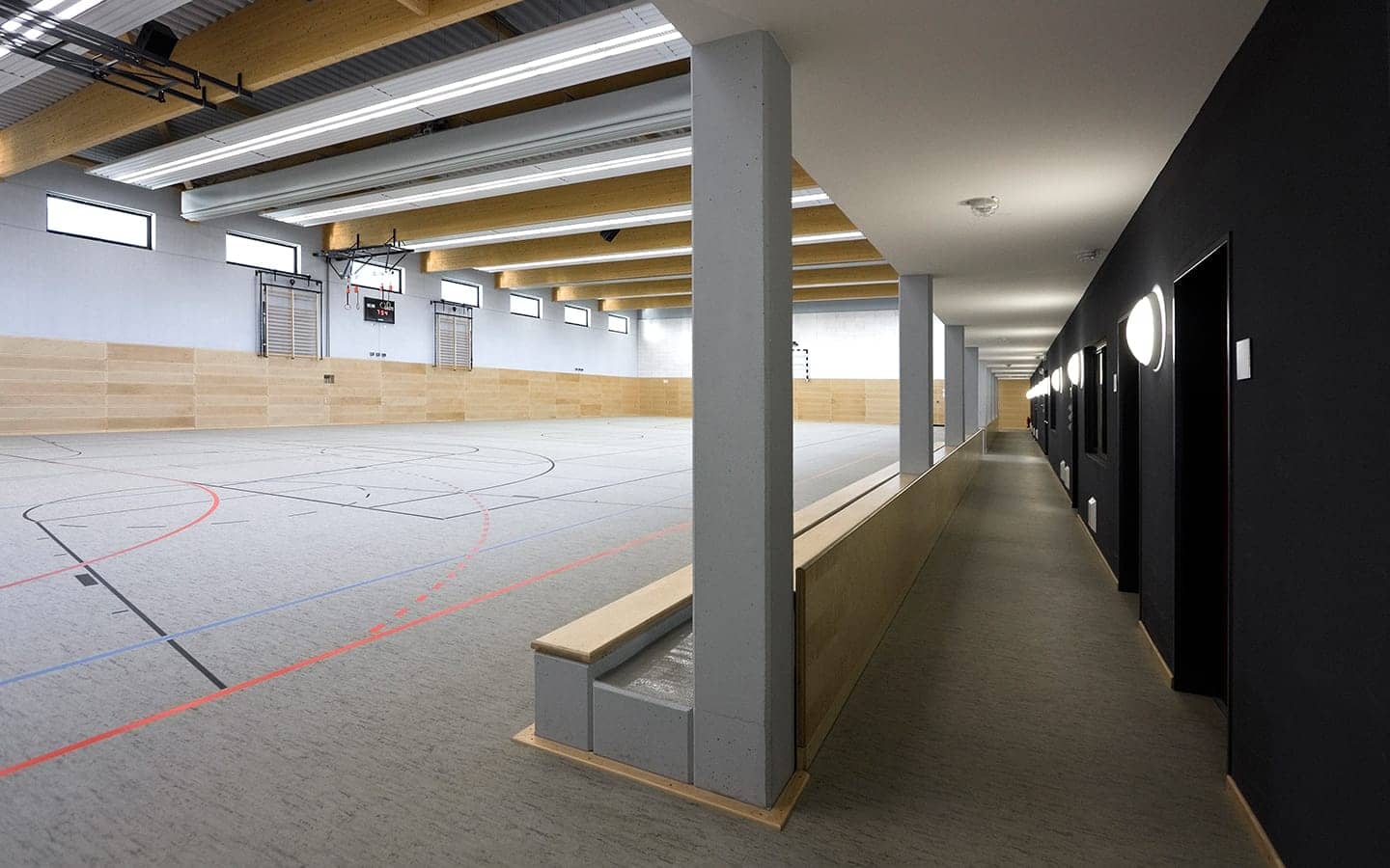 Der Neubau der Sporthalle Ockstadt steht dem Schul- und Vereinssport zur Verfügung. Die Sportfeldabmessungen von 22x44m können mittels Trennvorhängen in drei Trainingsfelder unterteilt werden. Eine offene, fest installierte Tribüne bietet Platz für 120 Zuschauer. Der Hallenkörper mit flach geneigtem Dach wird an den Giebelseiten von zwei massiven Wandscheiben eingefasst. Der eingeschossige Nebenraumtrakt ist der Nordfassade vorgelagert. Die öffenbaren Fenster der Halle ermöglichen eine natürliche Be- und Entlüftung. Auf dem Hauptdach wurde eine Photovoltaik-Anlage installiert.
