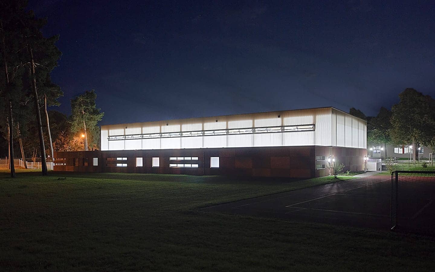 Die Komplettverglasung mit den Profilgläsern führt bei Tage zu einer blendfreien, gleichmäßigen Belichtung der Sportfläche, zum anderen verleiht sie der Halle im Betrieb bei Dunkelheit ein signifikantes Erscheinungsbild durch ihre Wirkung als „Leuchtender Kubus“. Auf dem Hallendach sind eine Photovoltaikanlage sowie eine Solarthermieanlage zur Warmwasserbeheizung installiert.
