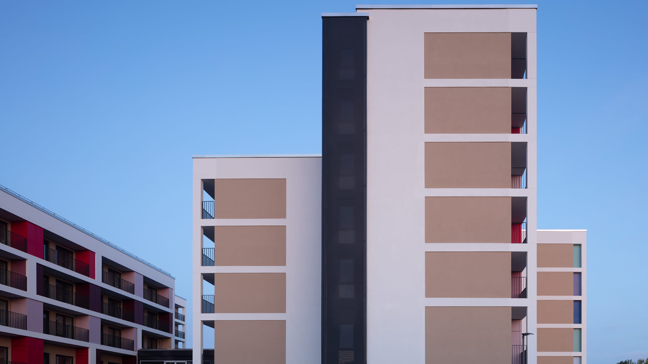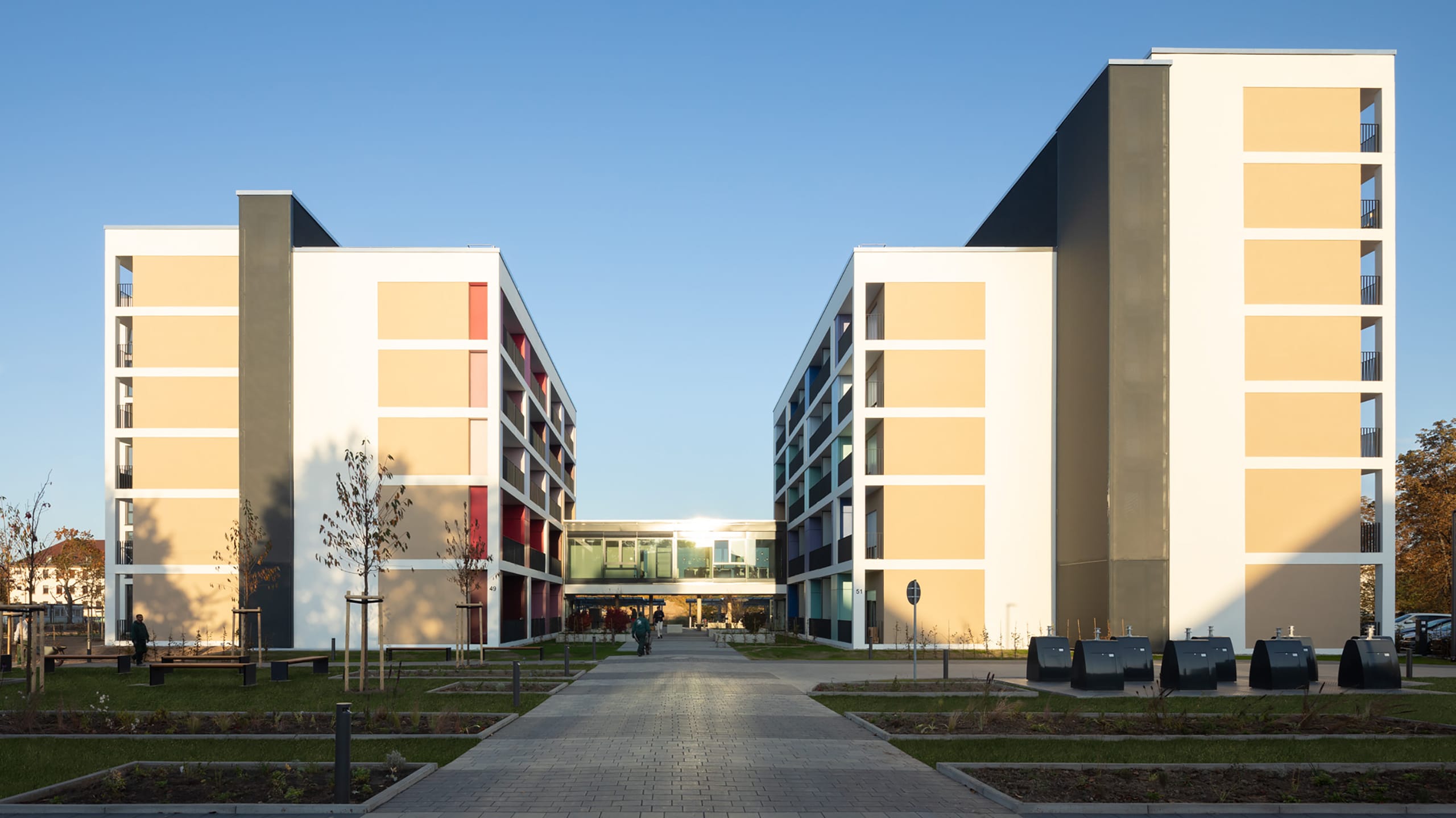 Jedes der 208 Apartments ist Teil eines innovativen Raum- und Möblierungskonzepts, verfügt über diverse digitale Angebote und hat eine eigene Loggia mit einem zugeordneten Abstellraum. Diese Loggien prägen mit ihrem kreativen Farbenspiel die Fassaden und sind Ausdruck einer anspruchsvollen Wohn- und Lebenskultur.